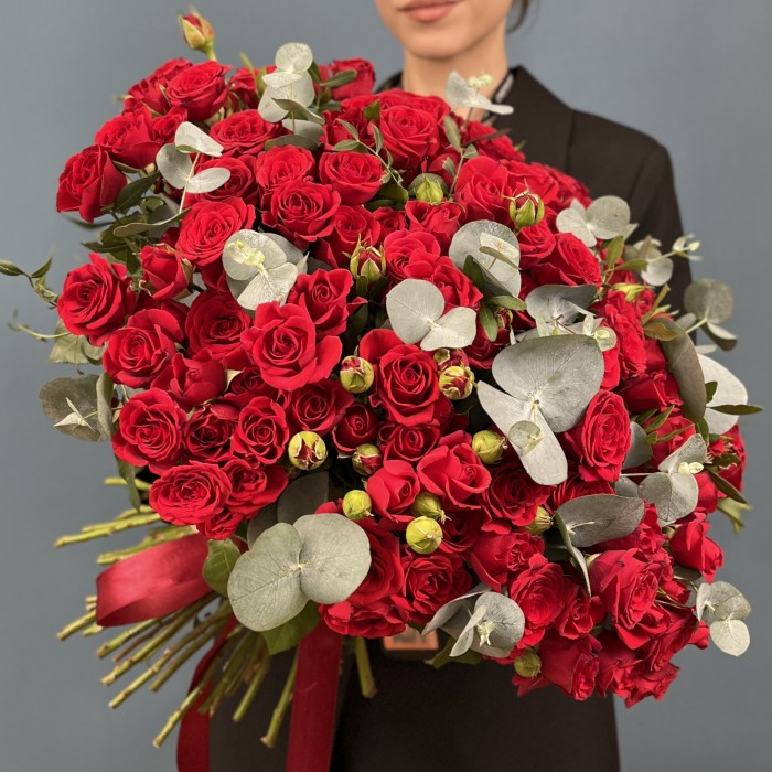Яркий и красивый букет из 51 кустовой розы красного цвета сорта Рубикон станет отличным подарком на день рождения или юбилей.