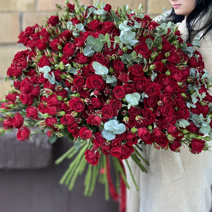 Яркий и красивый букет из 51 кустовой розы красного цвета сорта Рубикон станет отличным подарком на день рождения или юбилей.