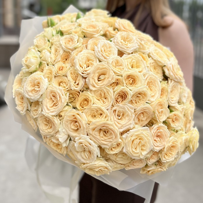 Букет из 51 кустовой кремовой розы сорта Аксана высотой 40 см — это великолепный выбор для тех, кто хочет выразить свои чувства с утонченностью и элегантностью! Кремовые розы символизируют нежность, искренность и чистоту, что делает их идеальными для романтических моментов, юбилеев или просто как знак внимания к близким.