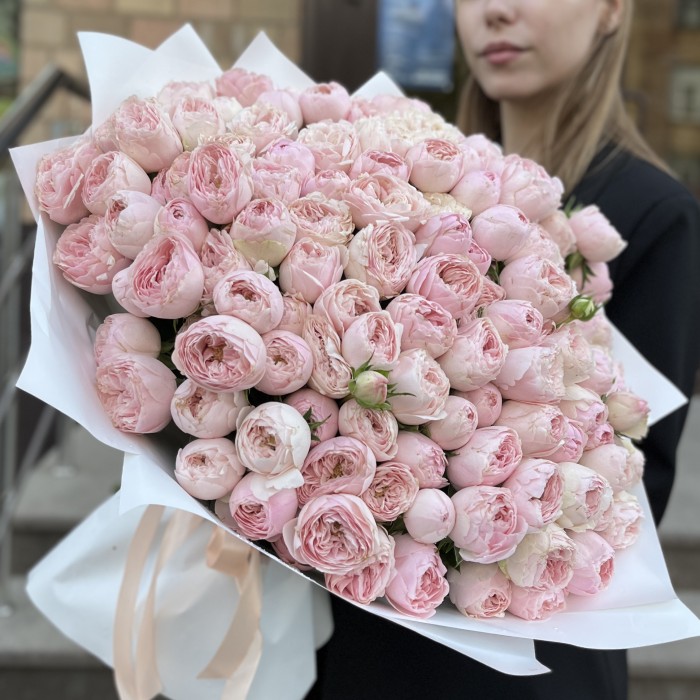 Этот роскошный букет состоит из 51 кустовой пионовидной розы сорта Мансфилд Пинк Парк 50 см, которые очаровывают своим нежным и утонченным цветом.