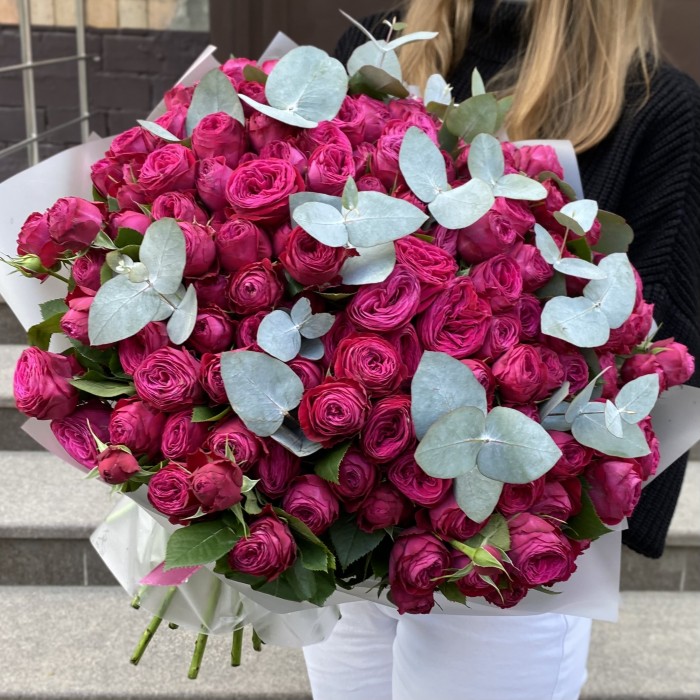 51 кустовая пионовидная роза "Пати Тренсеттер" с эвкалиптом в стильной упаковке — роскошная композиция с глубоким, насыщенным малиновым цветом и свежей зеленью эвкалипта. Идеально подчеркнет важный момент и порадует получателя.