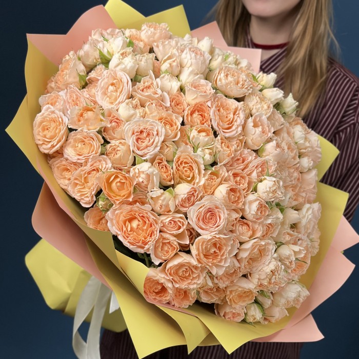 Впечатляющая композиция из 51 кустовой пионовидной розы сорта Минеола, высотой 40 см. Обильные, крупные цветы нежного оттенка создают яркую, пышную композицию. Такой объем подарит особое ощущение красоты и роскоши.