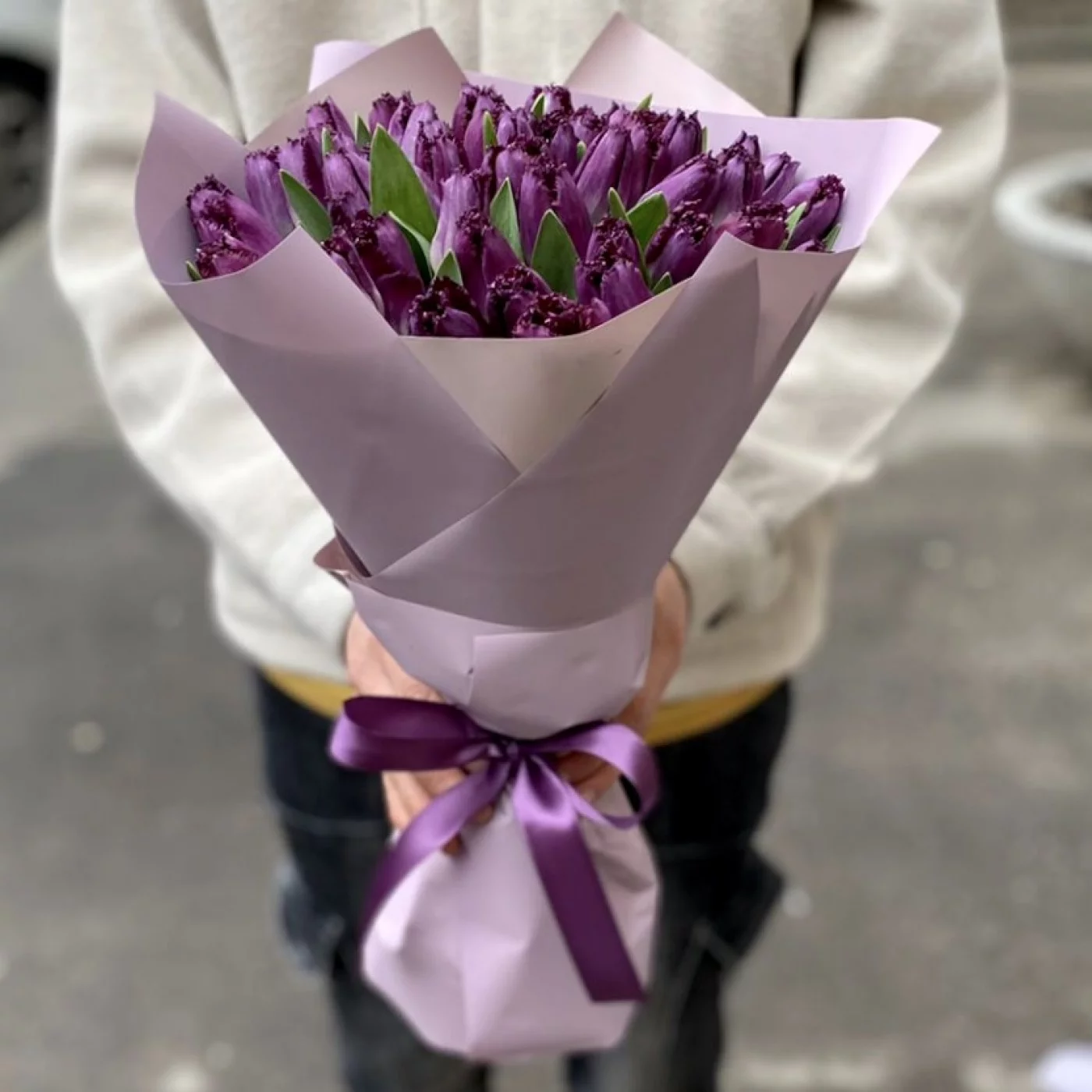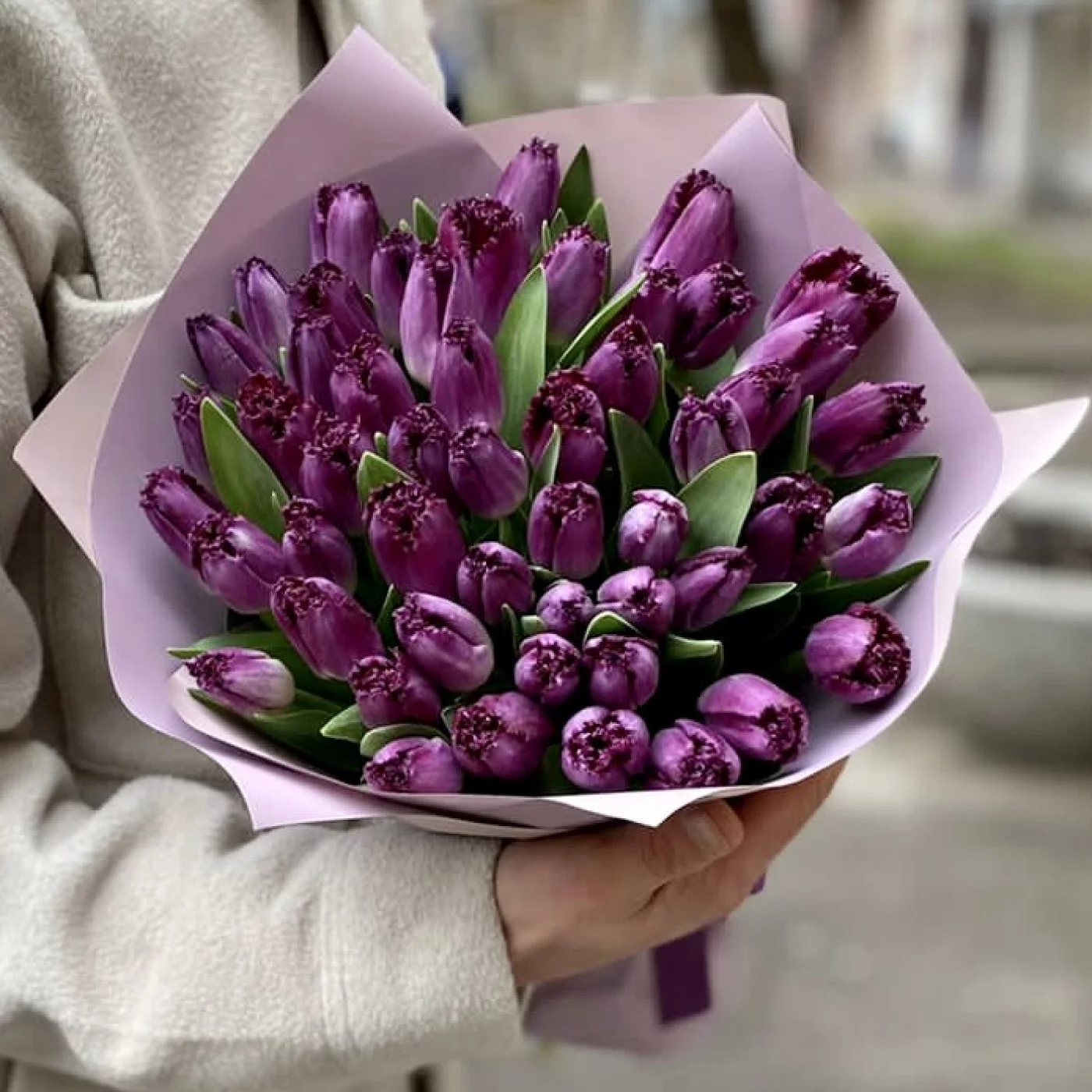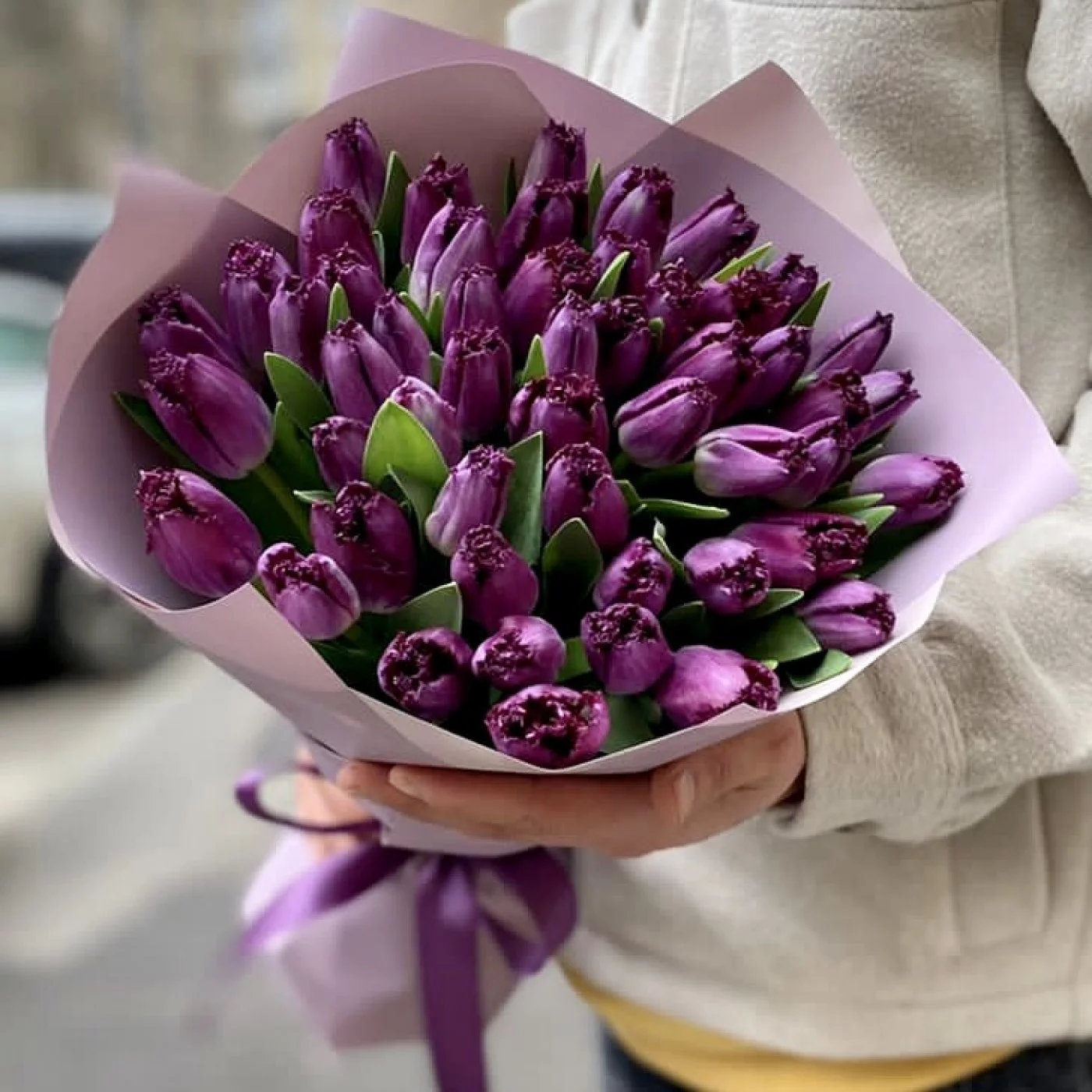 Букет из 51 фиолетового махрового тюльпана. Удивите получателя необычным букетом на день рождения или праздник 8 марта.