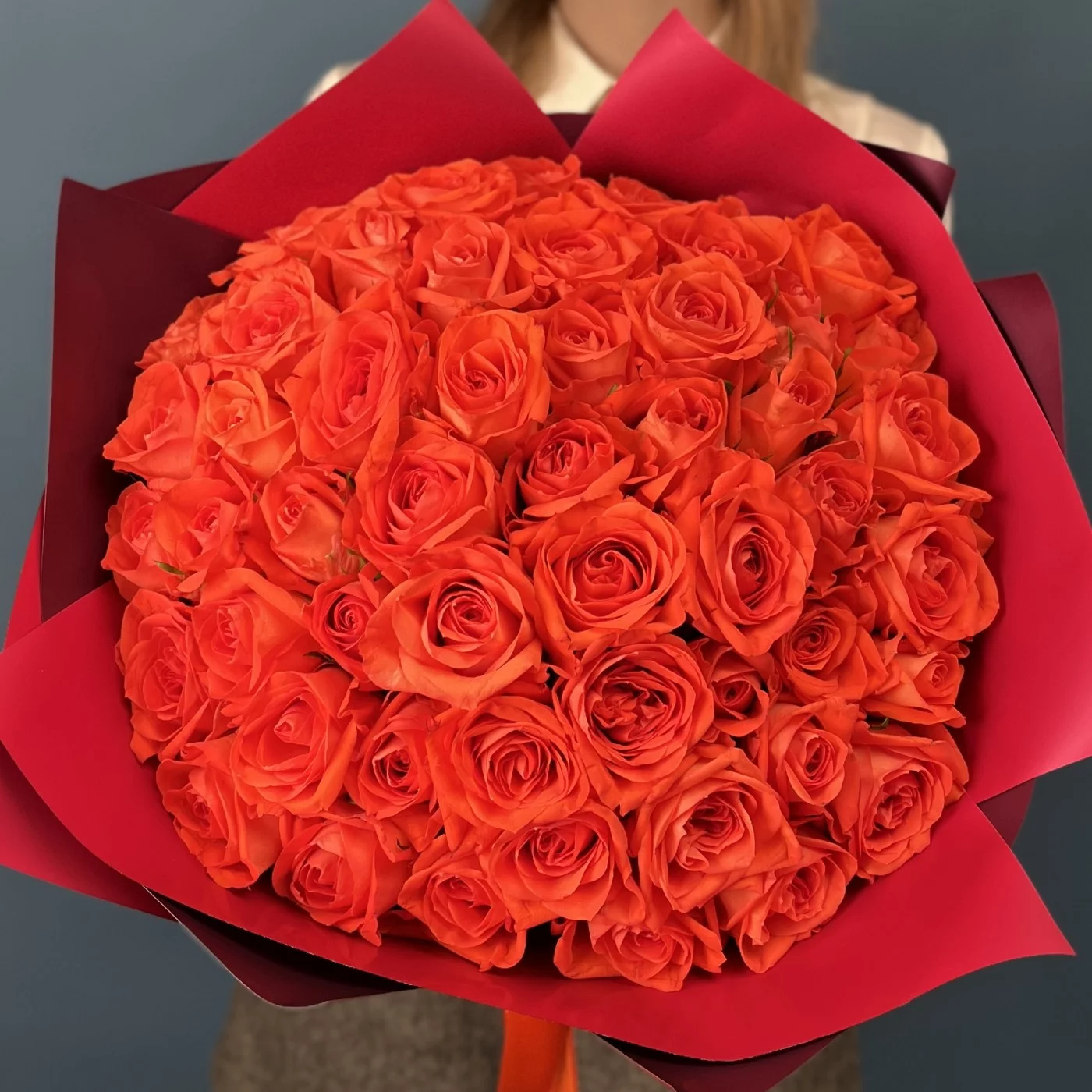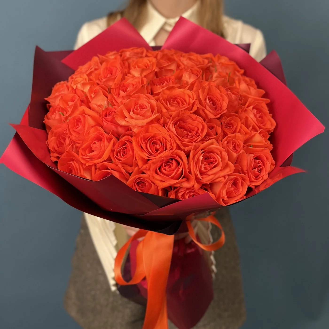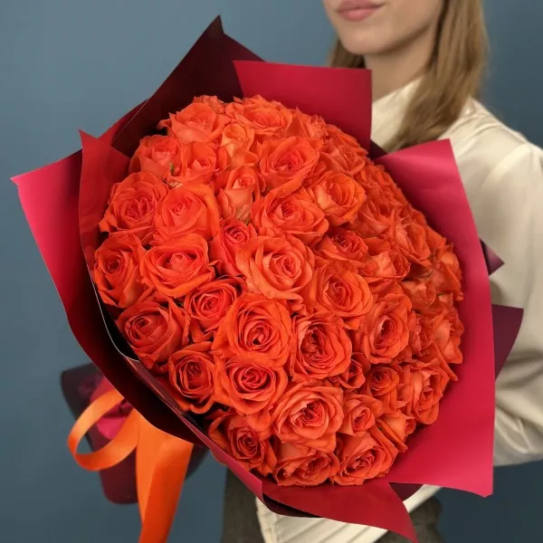 Великолепный букет из 51 розы сорта Копакабана насыщенного оранжевого цвета длиной 40 см — это яркое и торжественное воплощение энергии и жизнелюбия.