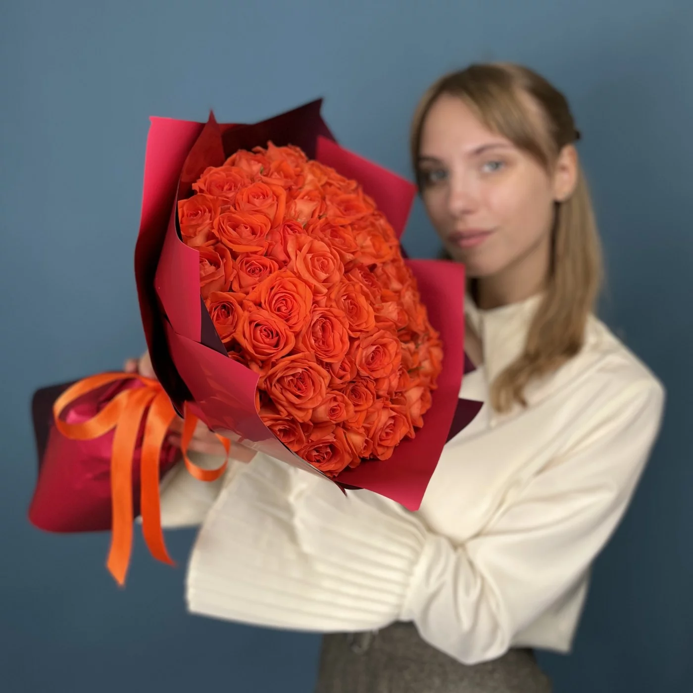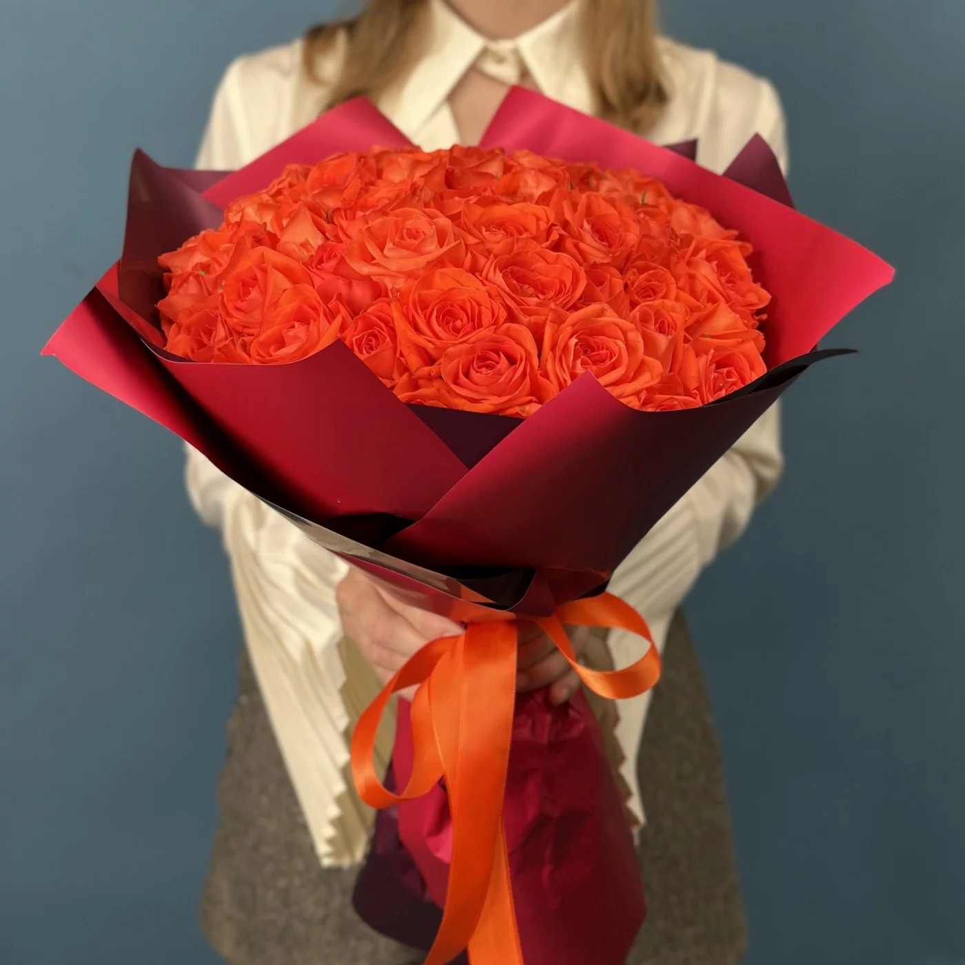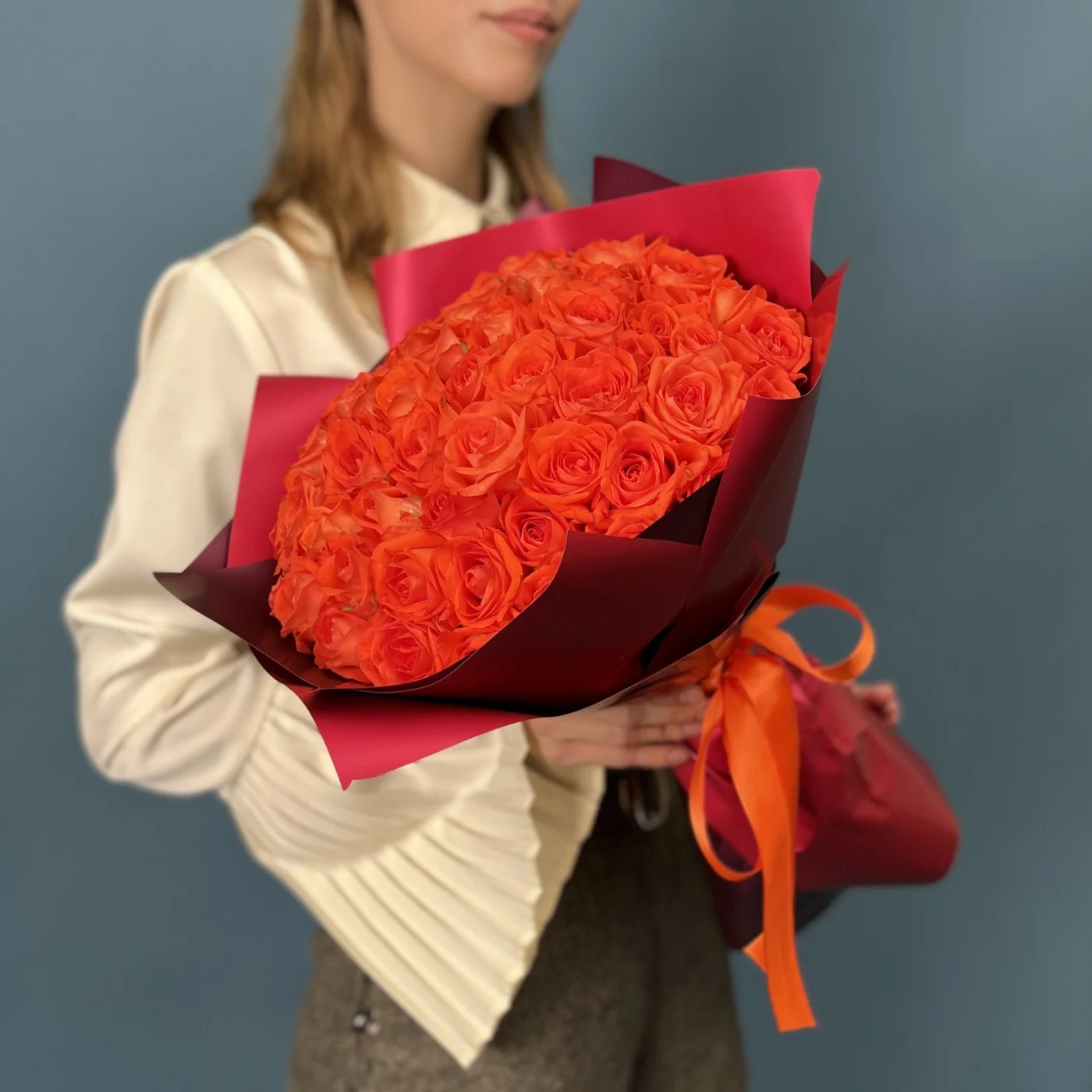 Великолепный букет из 51 розы сорта Копакабана насыщенного оранжевого цвета длиной 40 см — это яркое и торжественное воплощение энергии и жизнелюбия.