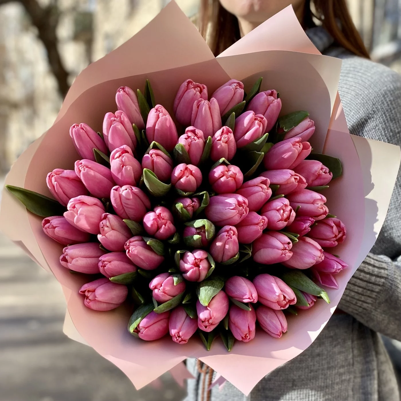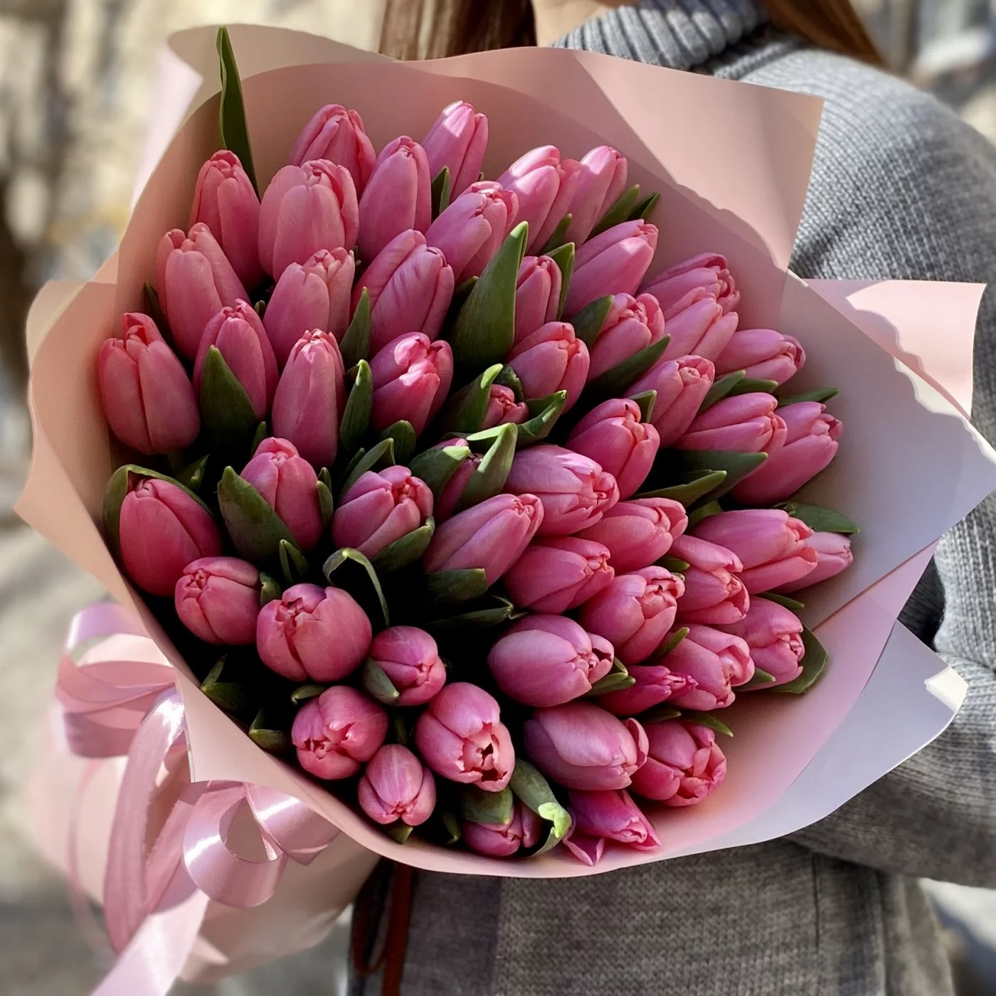 Букет из 51 розового тюльпана. Нежный и ароматный вариант букета для подарка на любое мероприятие. Особенно торжественно будет вручить этот букет на 8 марта.