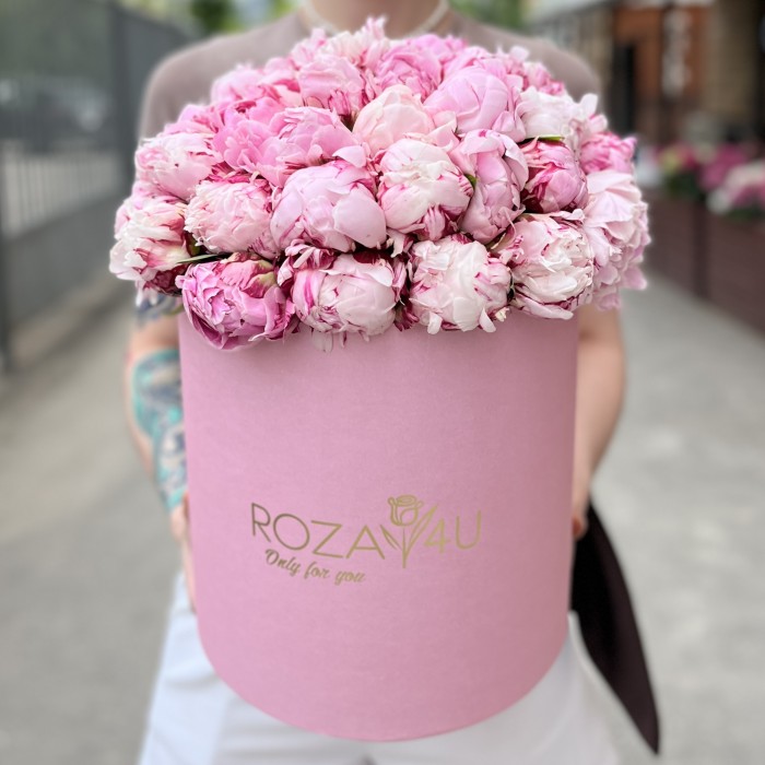 Роскошная композиция из 51 розового пиона сорта Сара Бернар в шляпной коробке удивит самую капризную девушку!