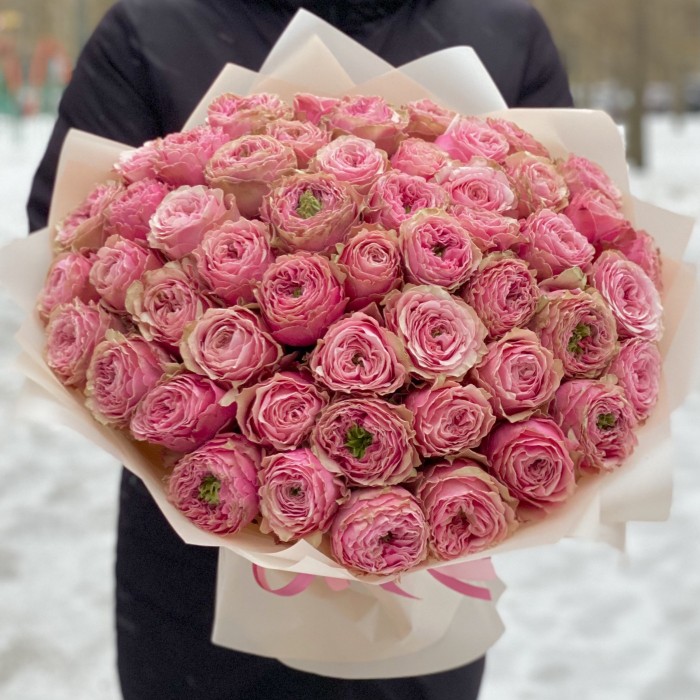 Букет из 51 пионовидной розы, удивительного и потрясающего сорта Белиз. Такой букет, получатель запомнит на долгое время. Красивые бутоны круглой формы розового цвета с необычной зеленой сердцевиной. Этот букет для тех кто хочет удивить и порадовать пионовидными розами, своих родных и близких