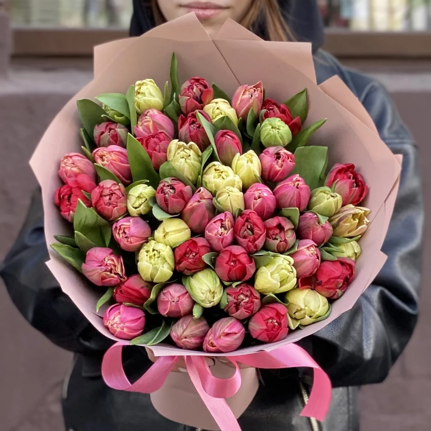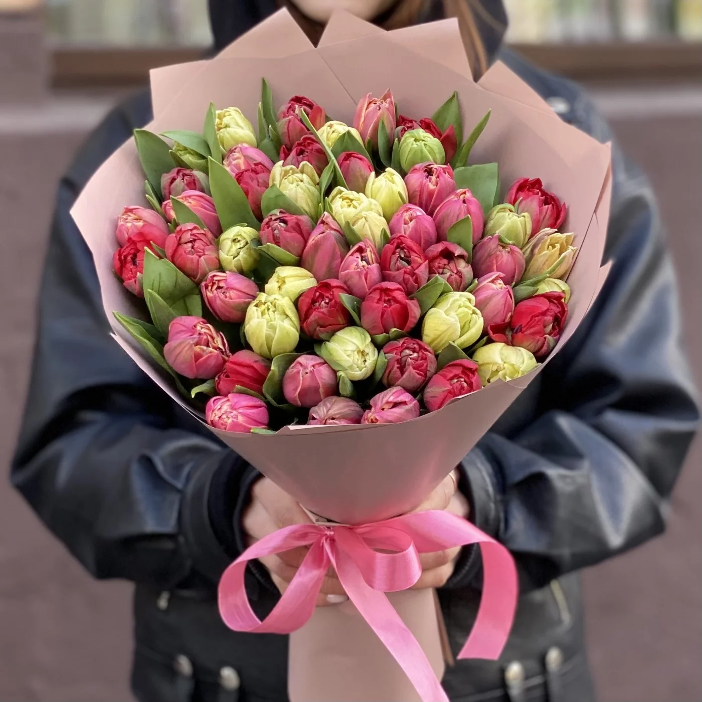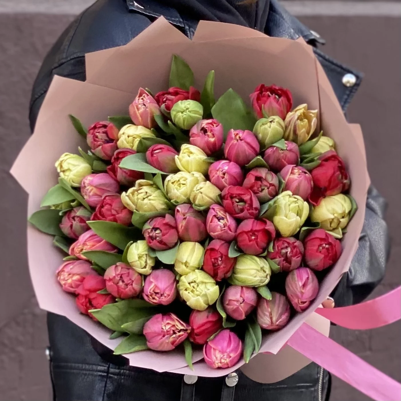 На нашем сайте можно заказать доставку свежих пионовидных тюльпанов в букете Яркий микс по Москве и области. Работаем круглосуточно! Перед отправкой пришлем фото композиции. Привезем вовремя и точно по указанному адресу.