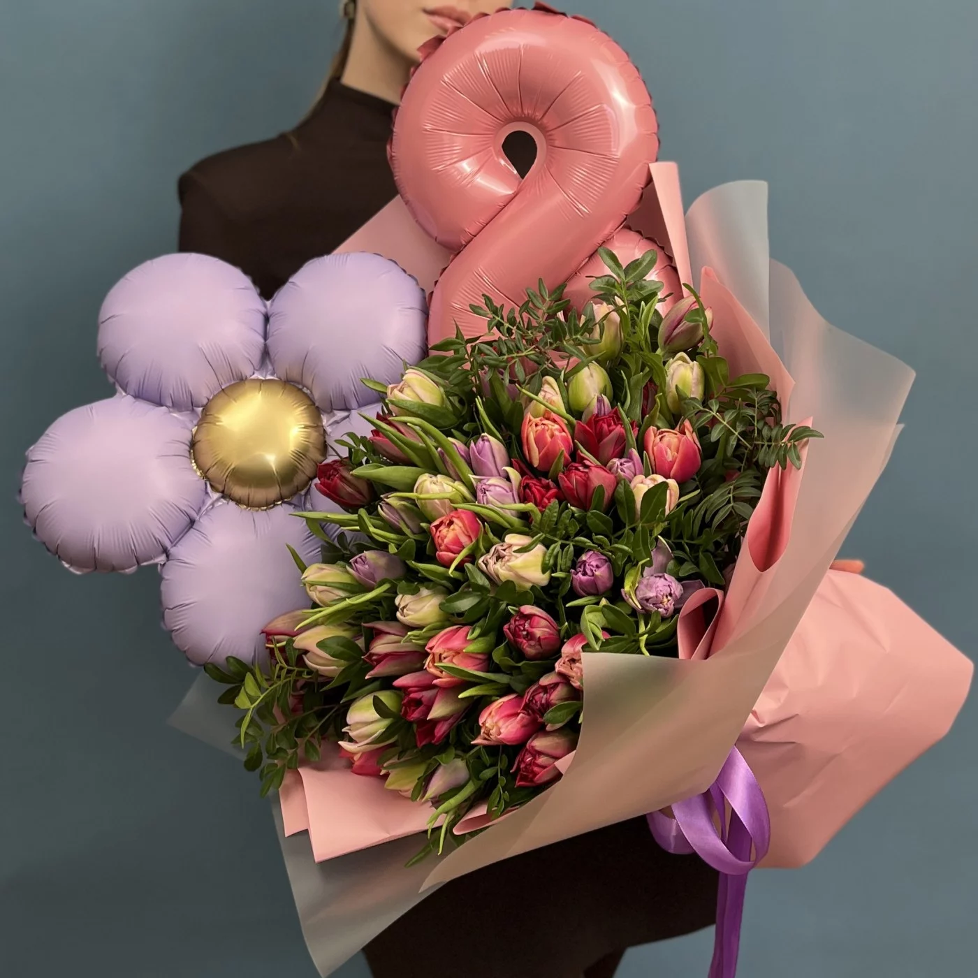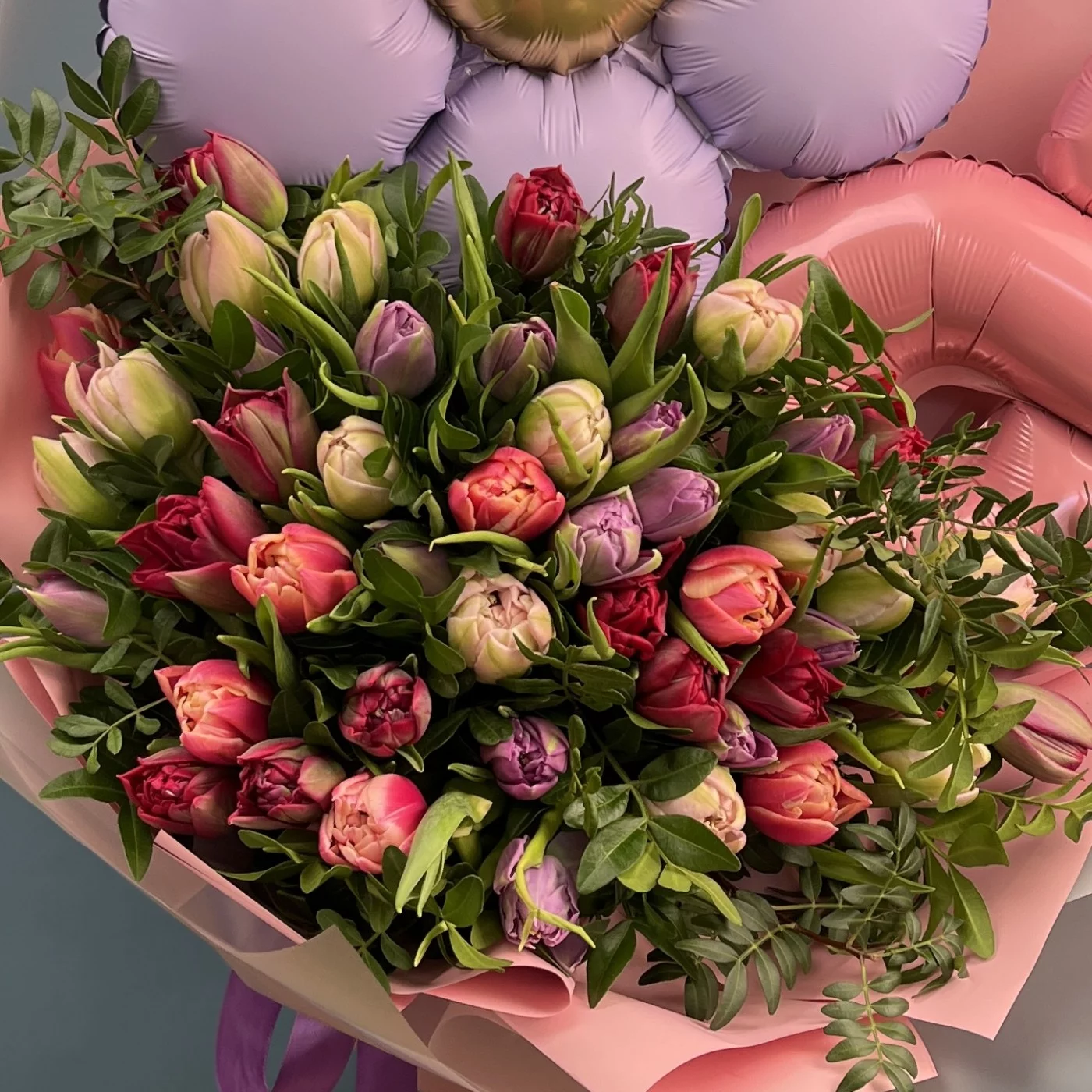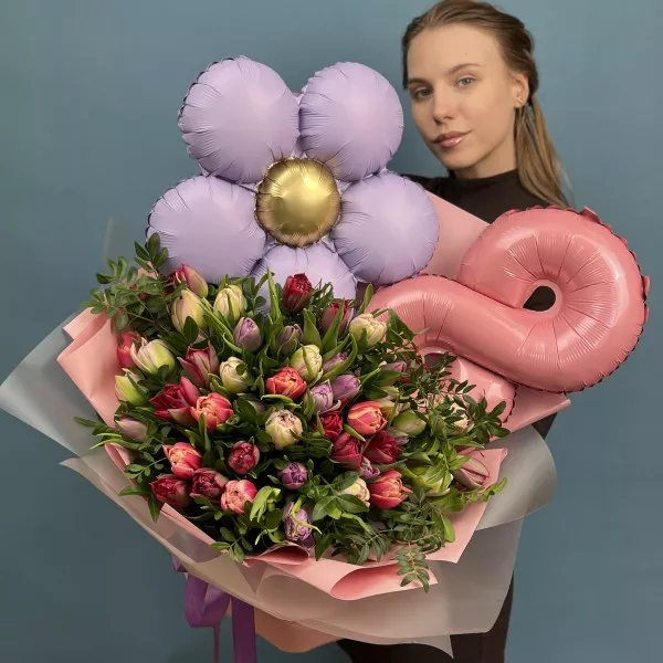 Этот великолепный букет из 51 пионовидного тюльпана в различных оттенках станет идеальным подарком для празднования Международного женского дня.