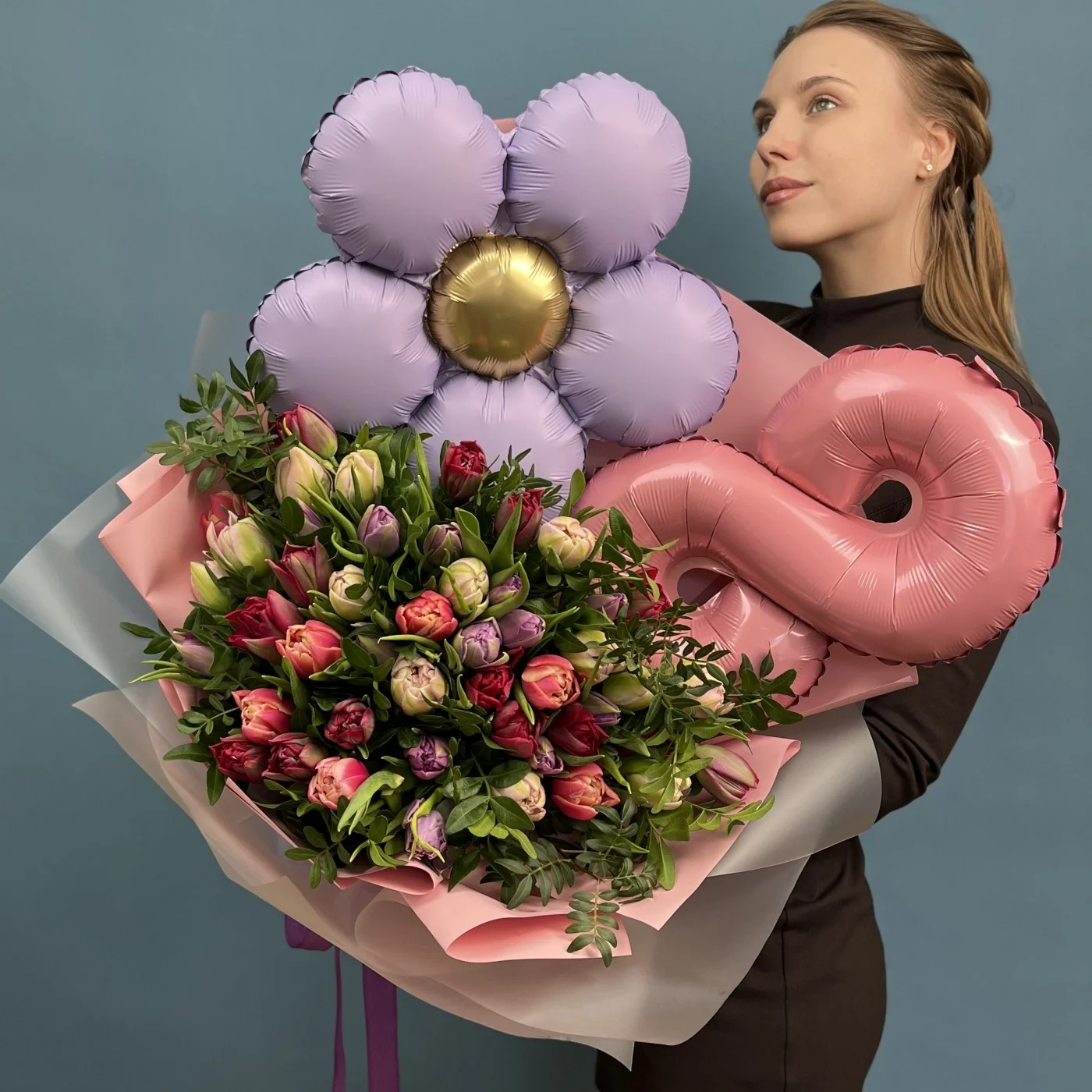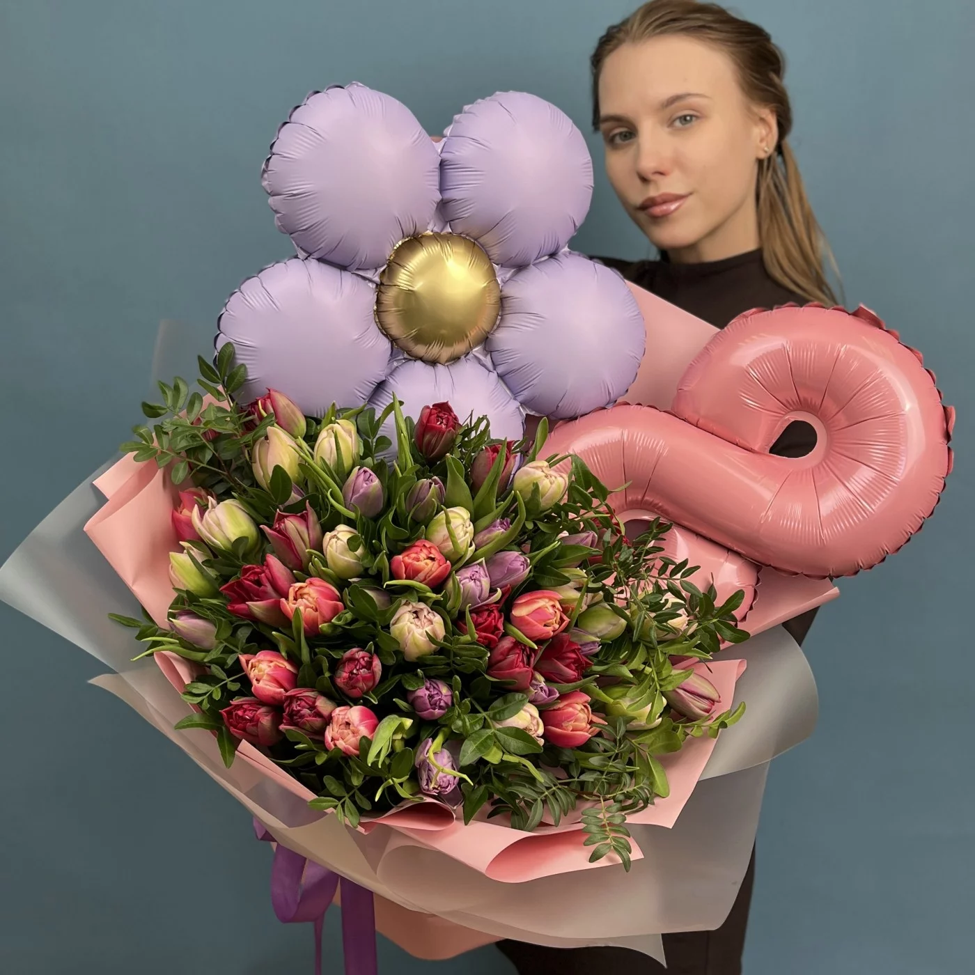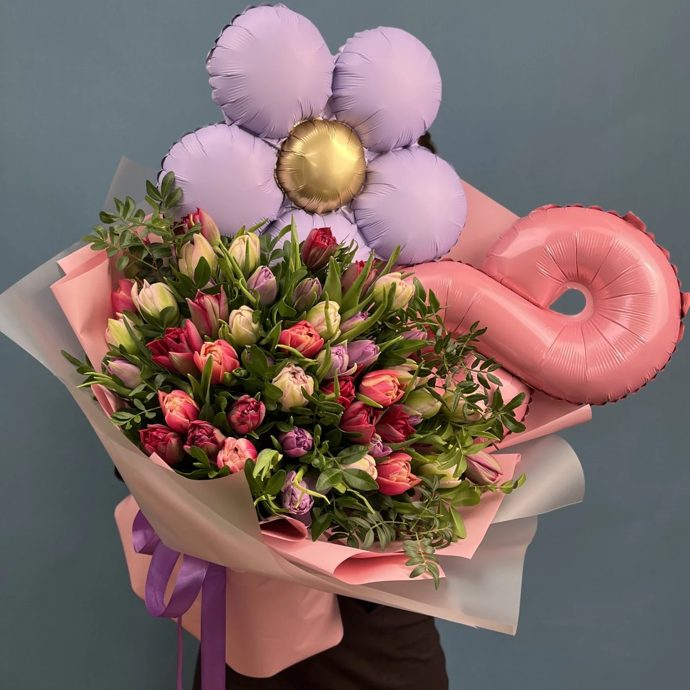 Этот великолепный букет из 51 пионовидного тюльпана в различных оттенках станет идеальным подарком для празднования Международного женского дня.