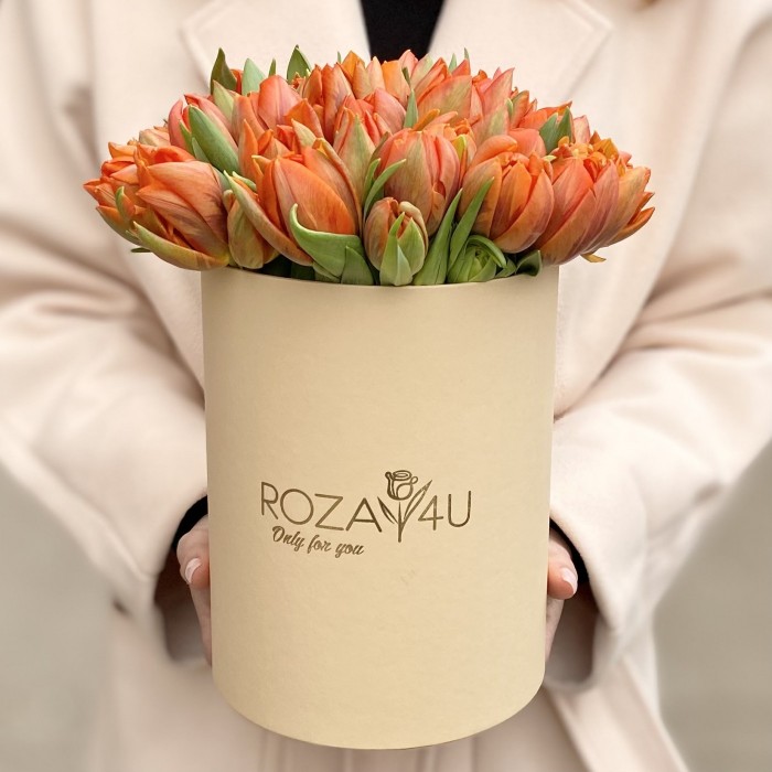 Яркая композиция с оранжевыми пионовидными тюльпанами сорта Эрмитаж даб в шляпной коробке станет отличным подарком для Вашей любимой или мамы.