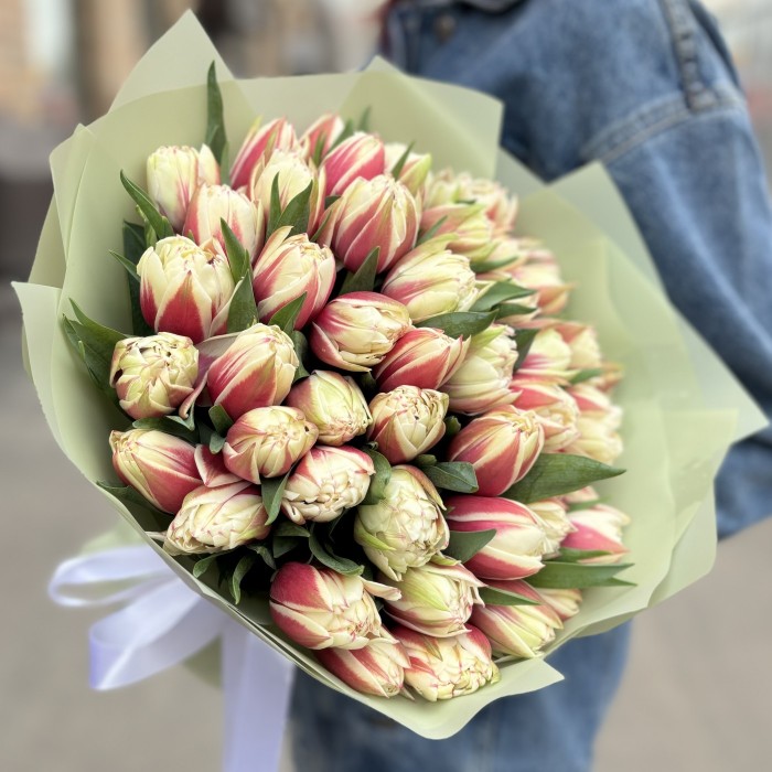 Букет из 51 пионовидного тюльпана Вермонт с очень красивым раскрытием бутона подойдет для самой нежной девушки как знак внимания или подарок на день рождения.