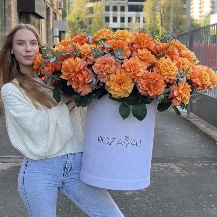 51 пышная роза сорта Фри Спирит с эвкалиптом в коробке. Эвкалипт добавляет текстуру и свежесть, подчеркивая красоту цветов.