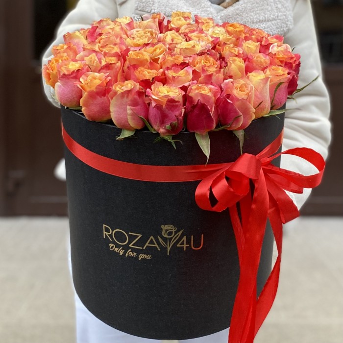 роза 3D - 51 шт, лента атлас, шляпная коробка.