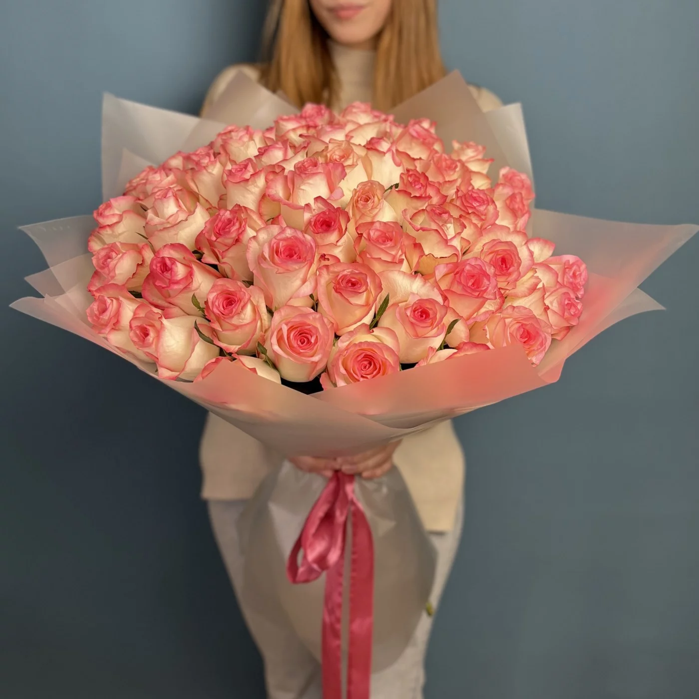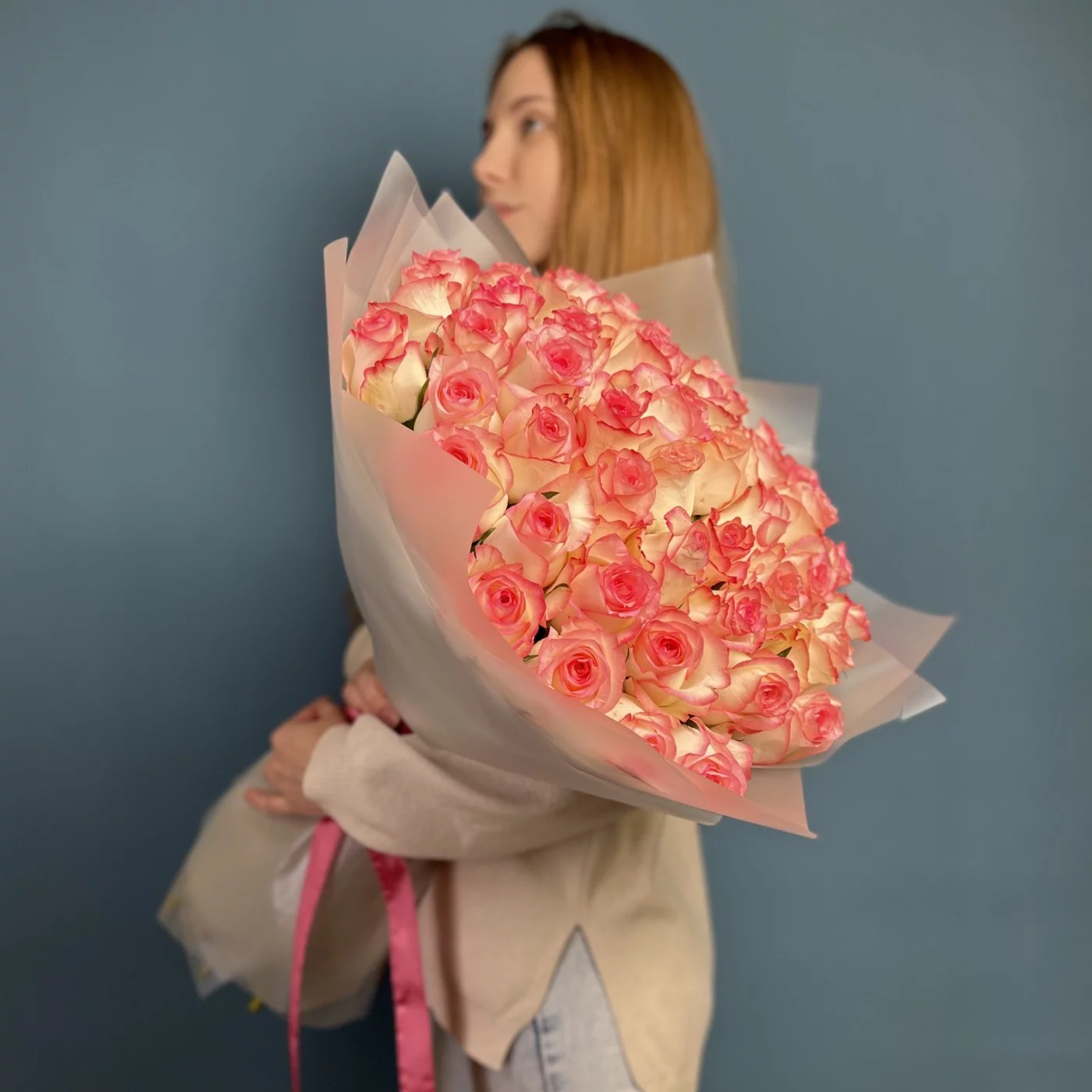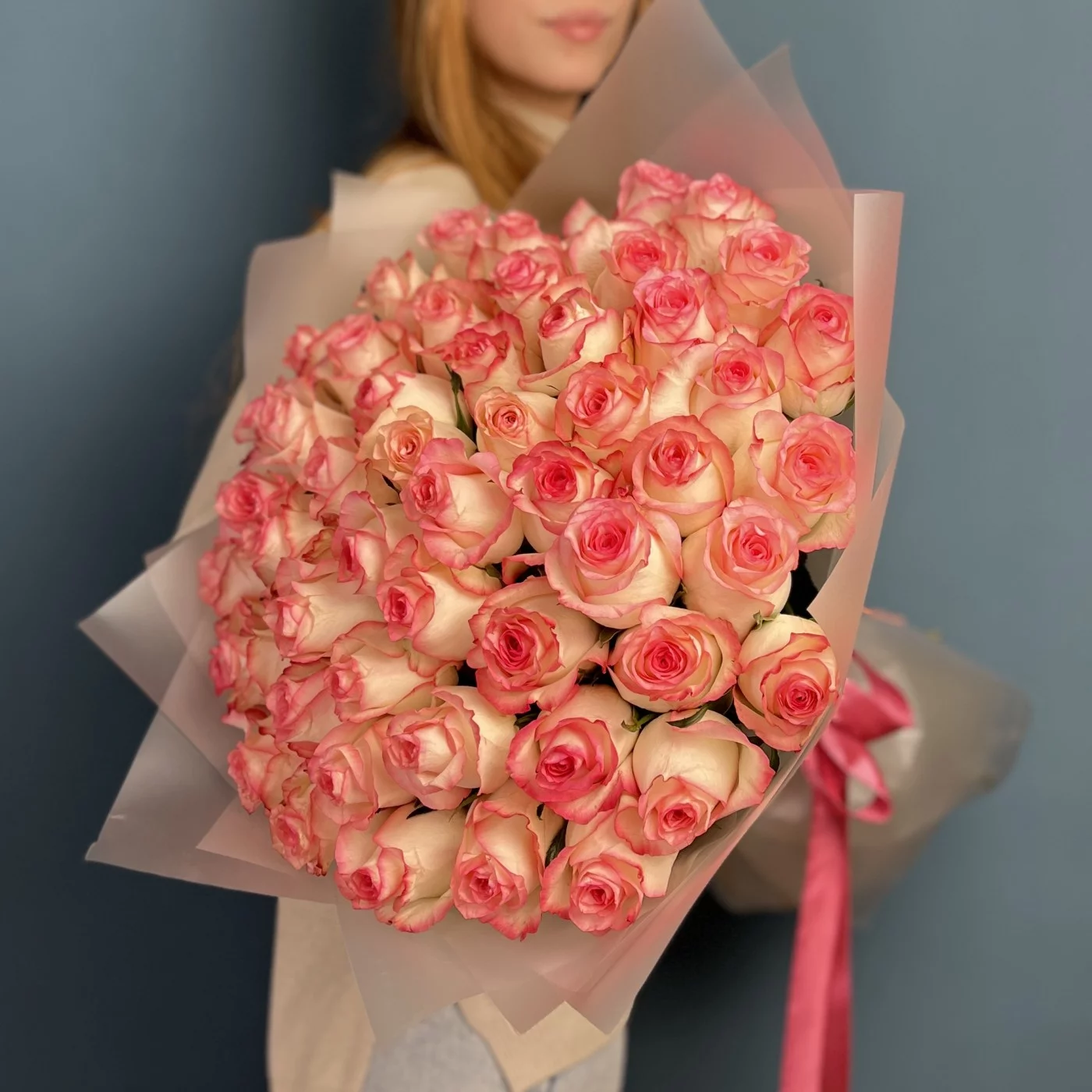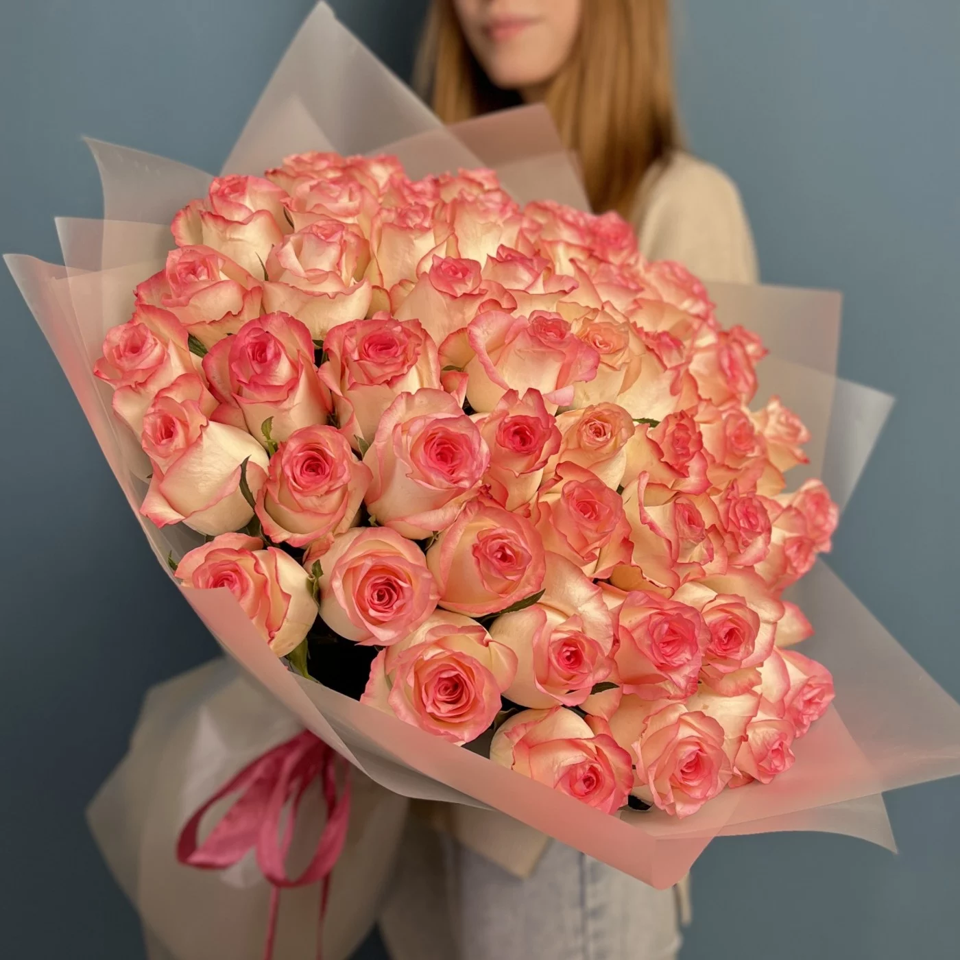 Букет из 51 розы сорта Джумилия высотой 60 см — это великолепный букет, который отличается своей красотой и элегантностью. Розы этого сорта известны своими крупными, ярко-розовыми цветками и насыщенным ароматом, что делает этот букет идеальным выбором для романтических событий и особых моментов.