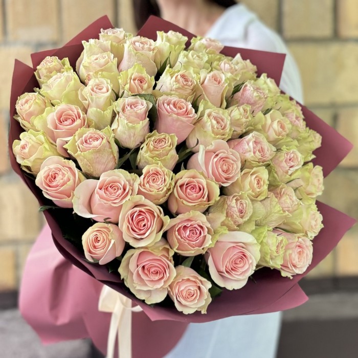 Большой букет из 51 розы сорта Фруттето с легким сладковатым ароматом – это великолепный и роскошный подарок на любой случай. Нежно-розовые розы с фисташковыми лепестками по краям собраны в полусферу, такой букет можно перевязать шелковой лентой или упаковать в стильную цветную матовую пленку. Букет из 51 розы Фруттето не только произведет незабываемое впечатление, но и подчеркнёт ваш эксклюзивный и безупречный вкус.