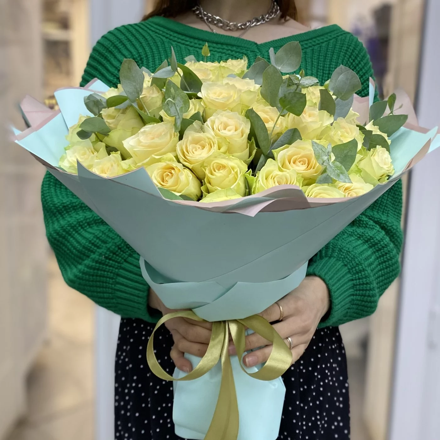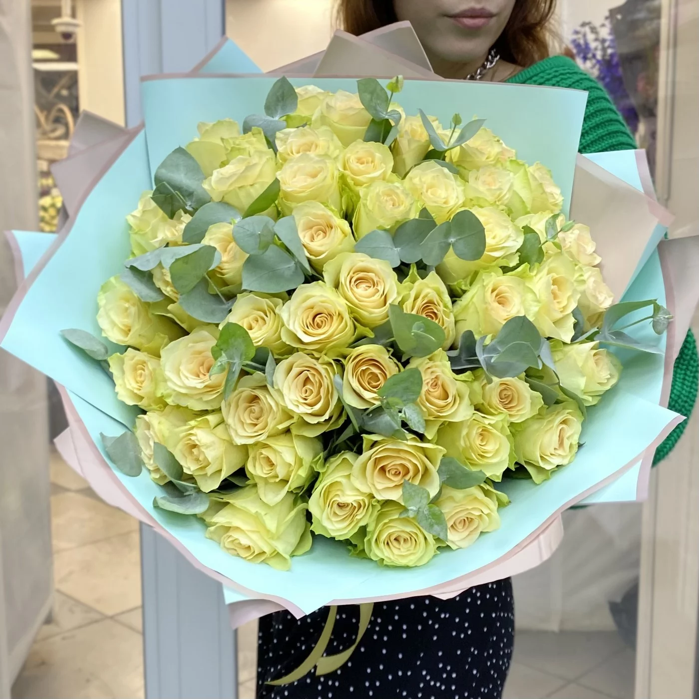 Свежая, ароматная роза Киви в сочетании с душистым эвкалиптом прекрасно смотрится в составе букета из 51 цветка. Нежный градиентный переход от салатового к розовому делает эту необычную розу особенно любимой среди девушек. Хотите удивить получателя не только количеством, но и качеством розы, тогда этот букет для Вас! Профессиональные флористы ROZA4U с любовью соберут для Вас цветы, а пунктуальные курьеры доставят заказ точно в срок.