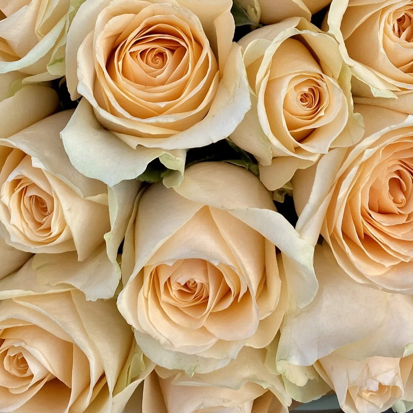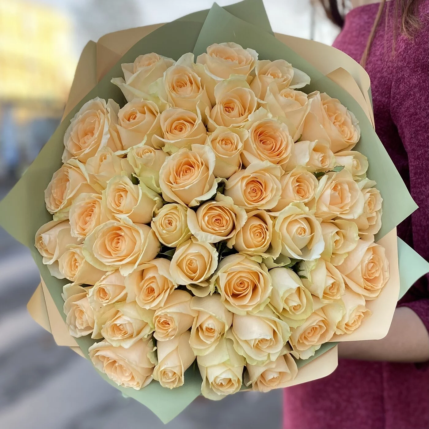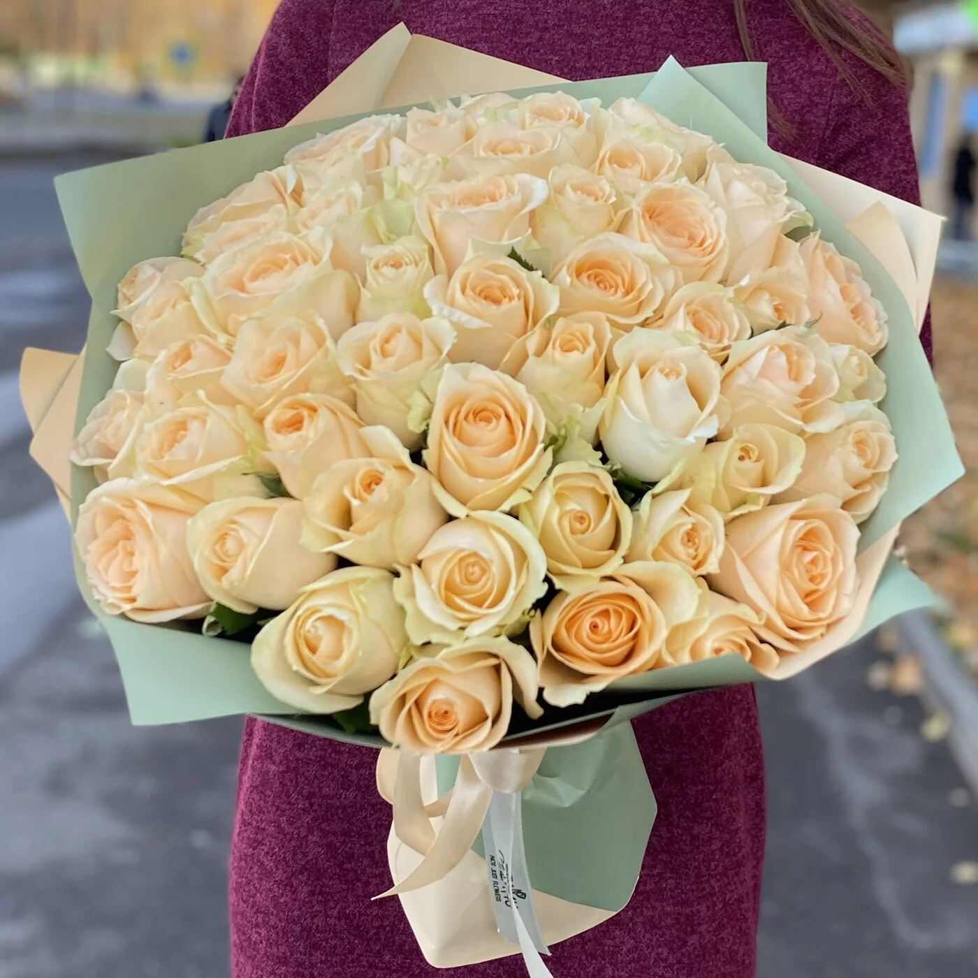 Букет из 51 кремовой розы сорта Пич Аваланш. Нежный букет прекрасно подойдет в качестве комплемента на любое событие.