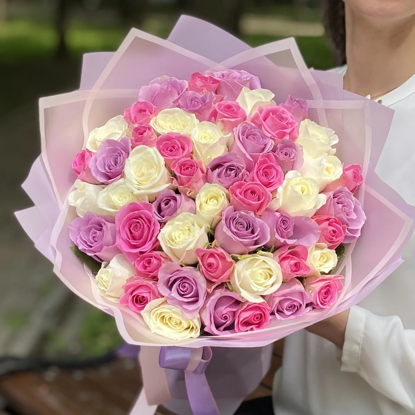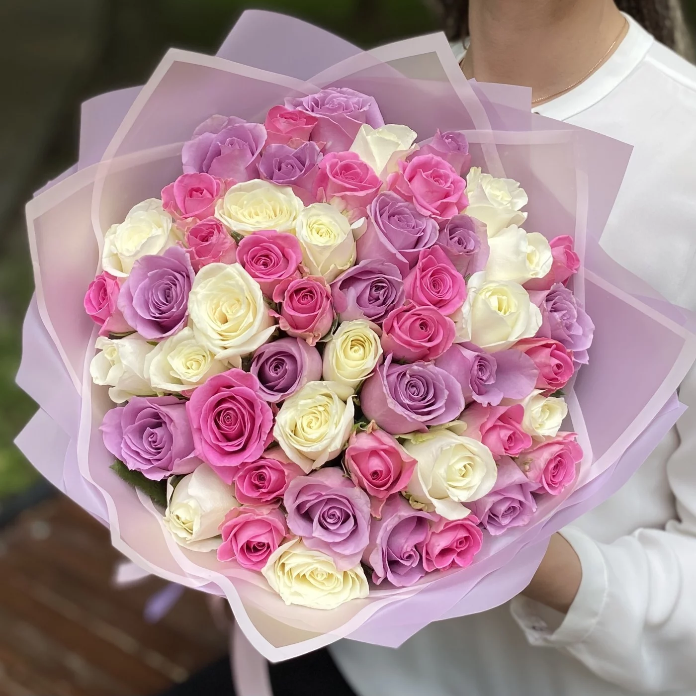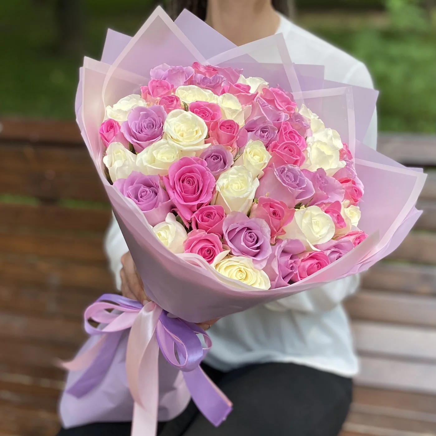 Микс из роз в нежных оттенках, будет уместно преподнести на свидание, День Рождения или подарить любимой женщине.