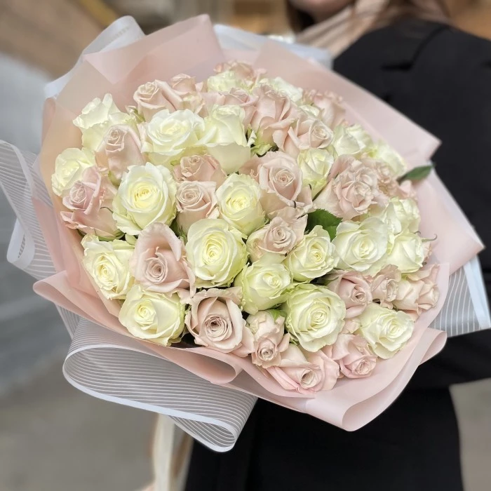 Нежное сочетание белых роз и необыкновенных роз сорта Мента. Это сочетание очень нежное и подойдет не только ко дню рождению, но и на юбилей или как простой знак внимания.