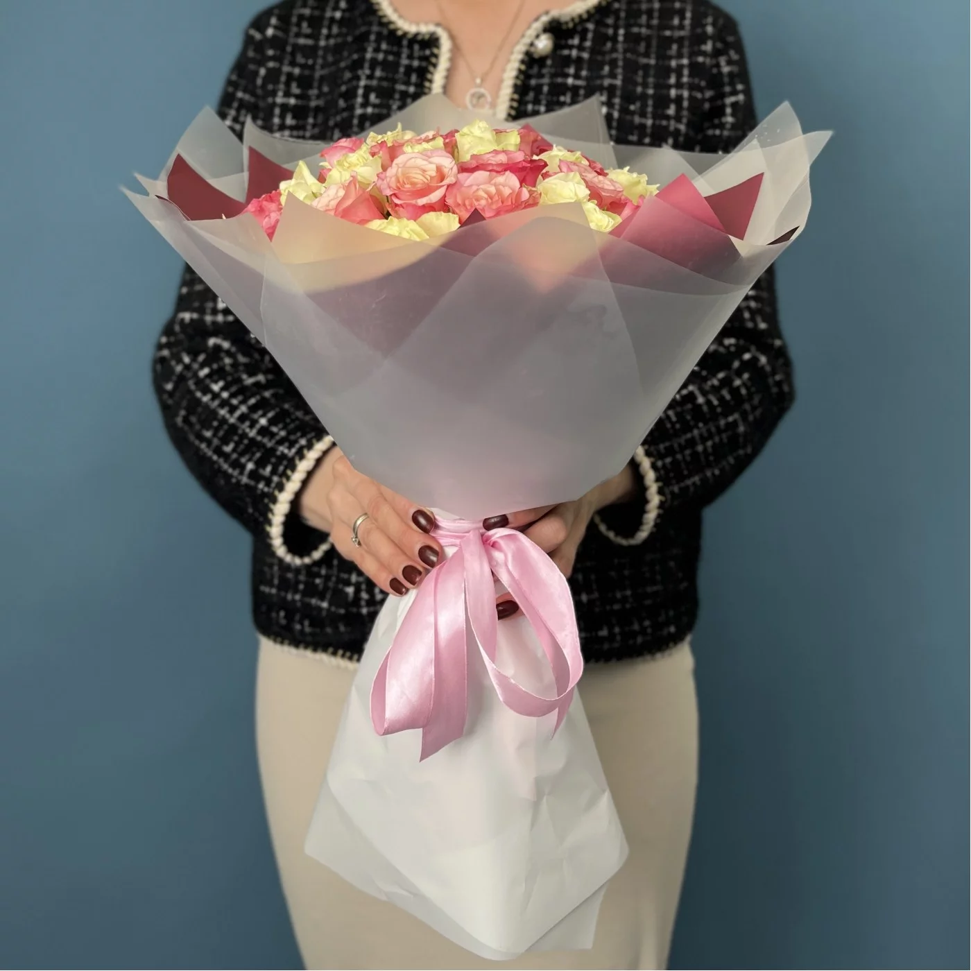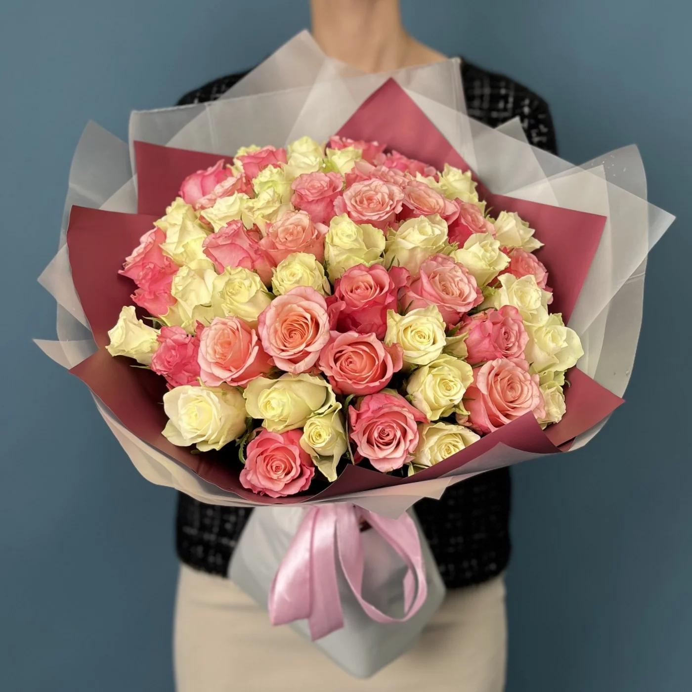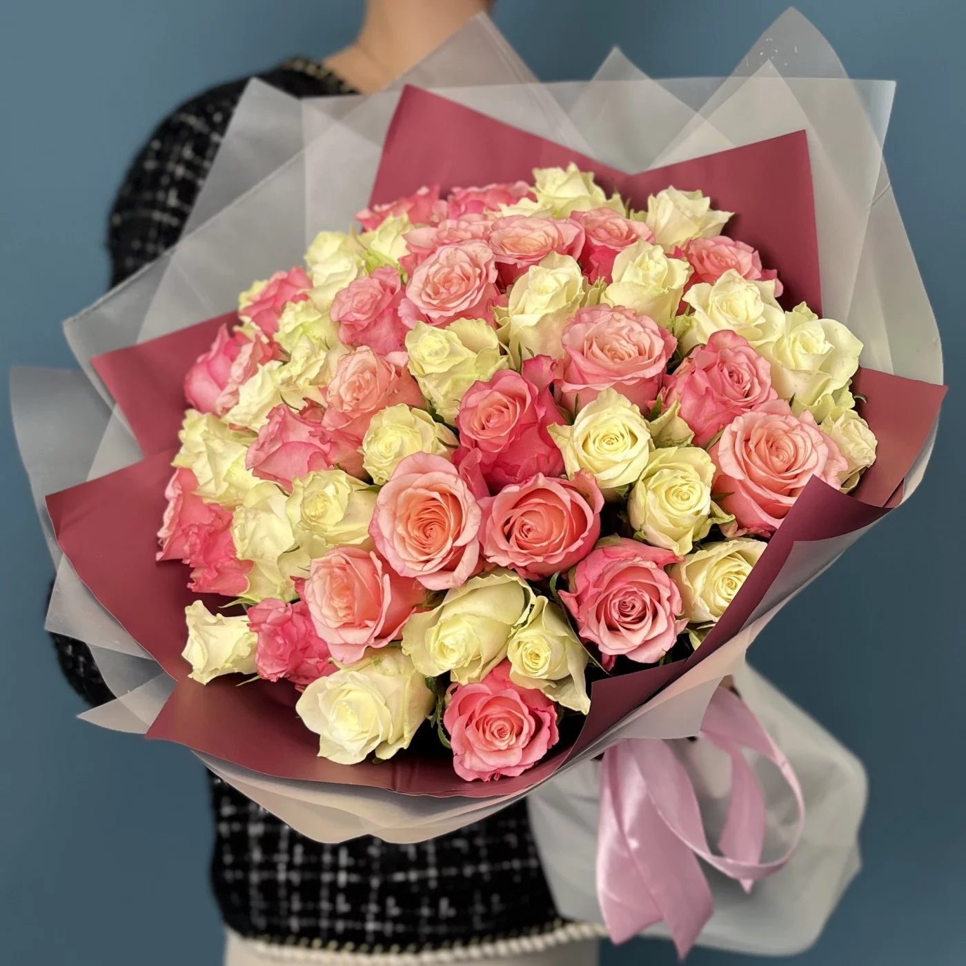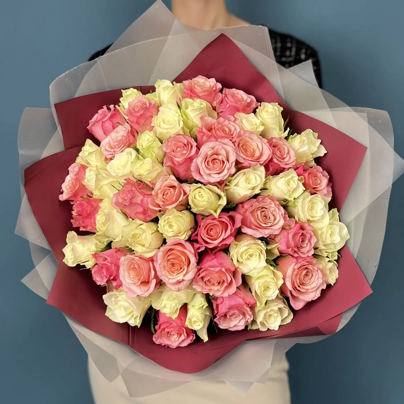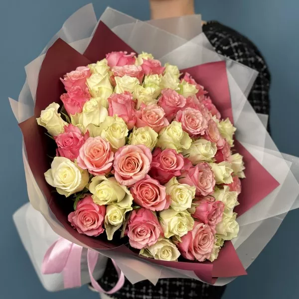 Букет из 51 розовой и белой розы — великолепный и символичный подарок на жемчужную свадьбу, которая отмечает 30 лет совместной жизни.