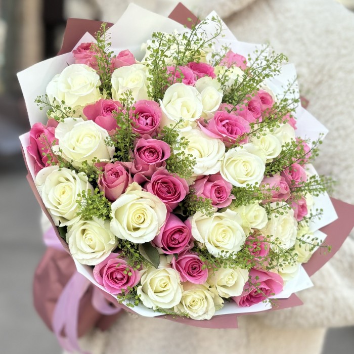 За три месяца мы доставили товар "51 розовая и белая роза с гринбелом" по следующим локациям: