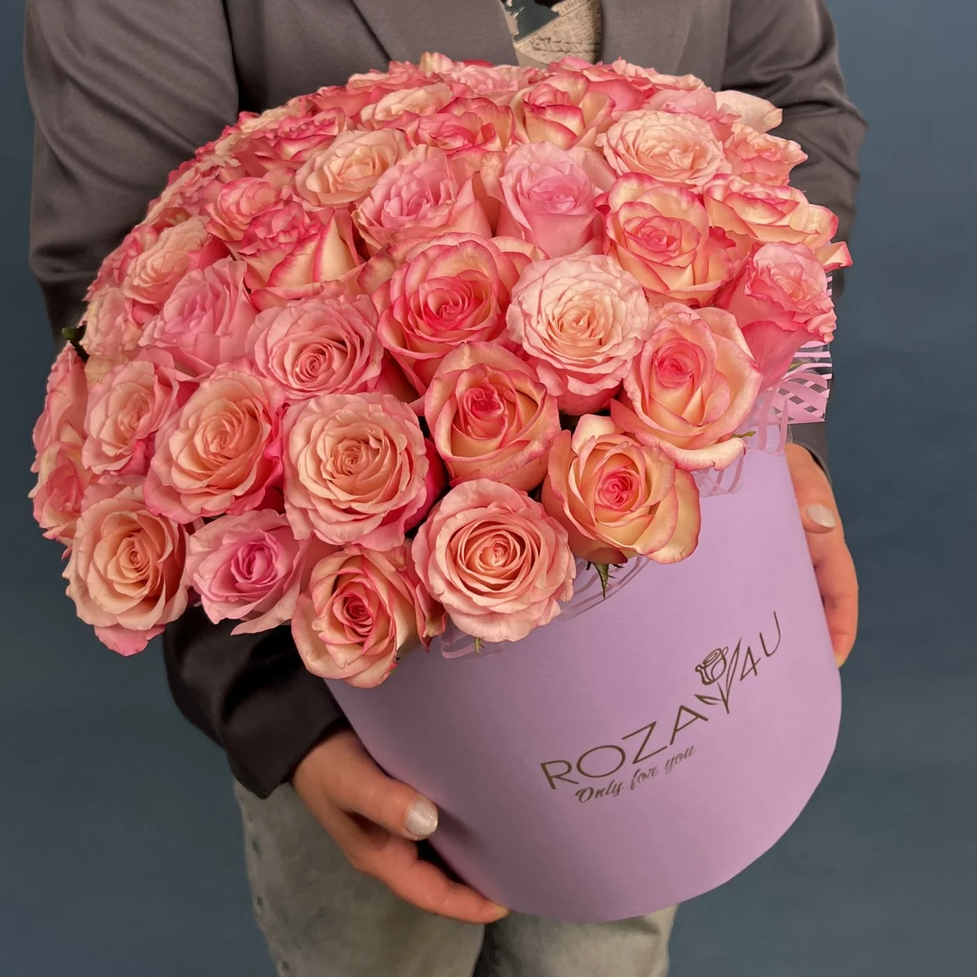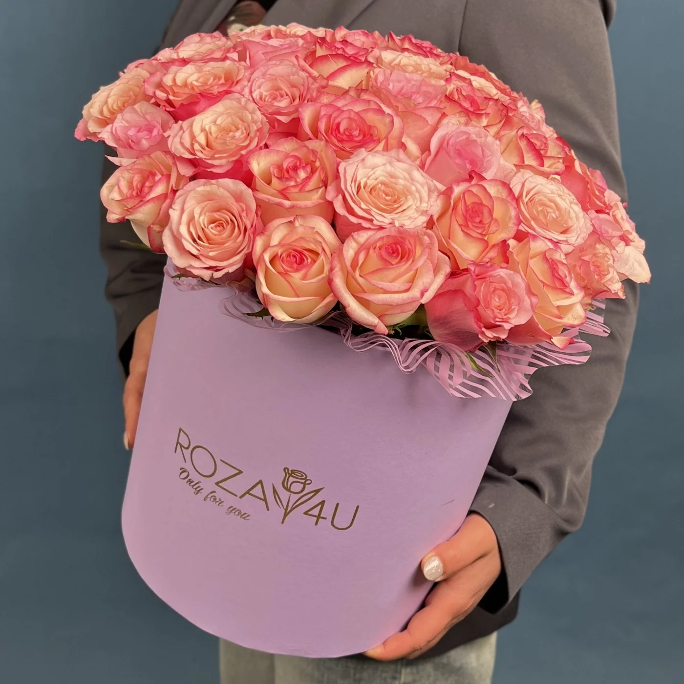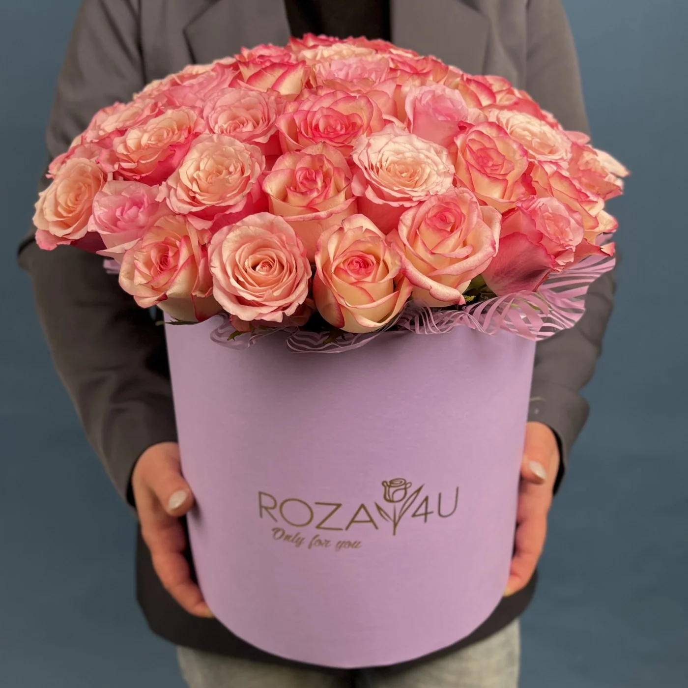 51 розовая роза Микс Алани в коробке — это изысканный и яркий подарок, который станет настоящим украшением любого торжества.