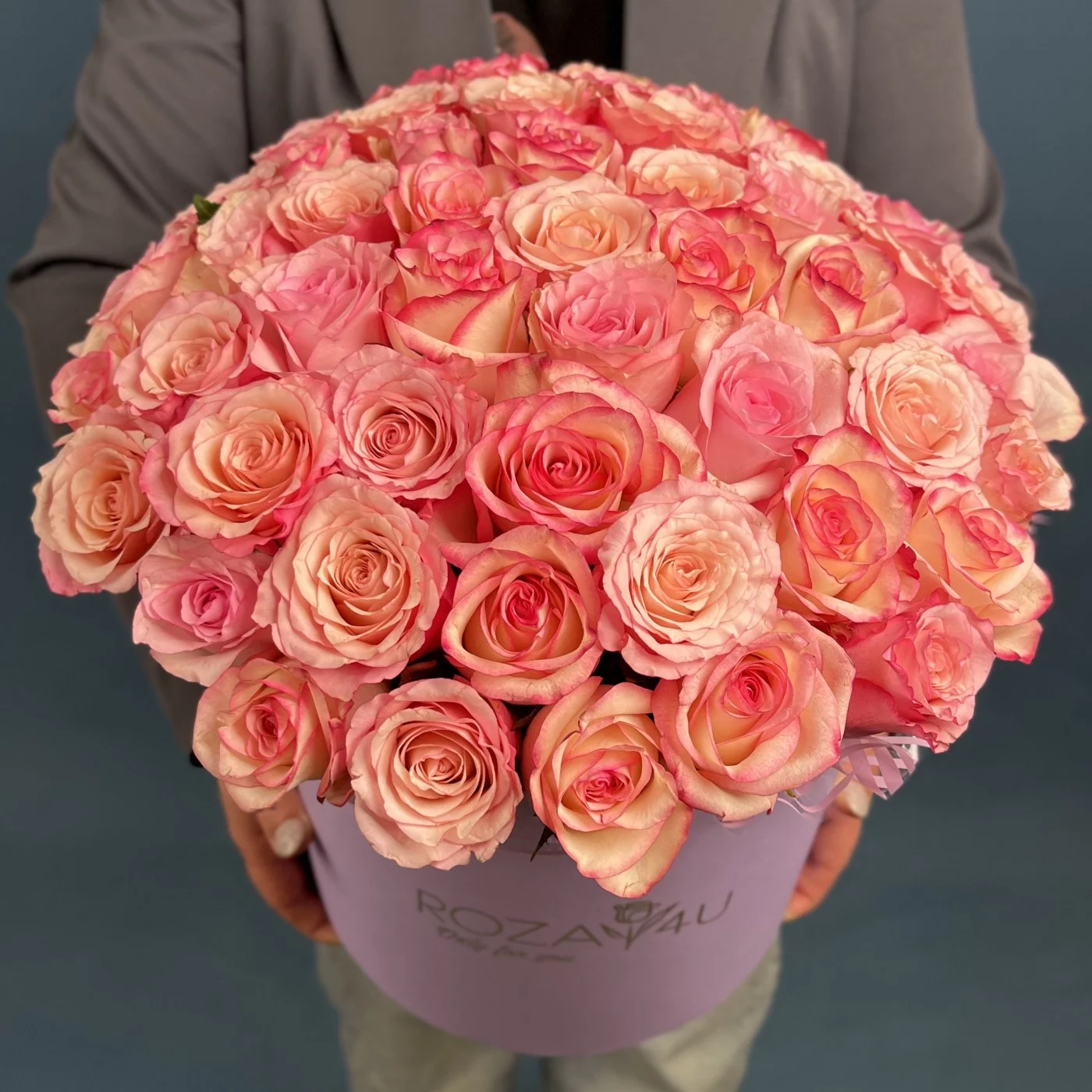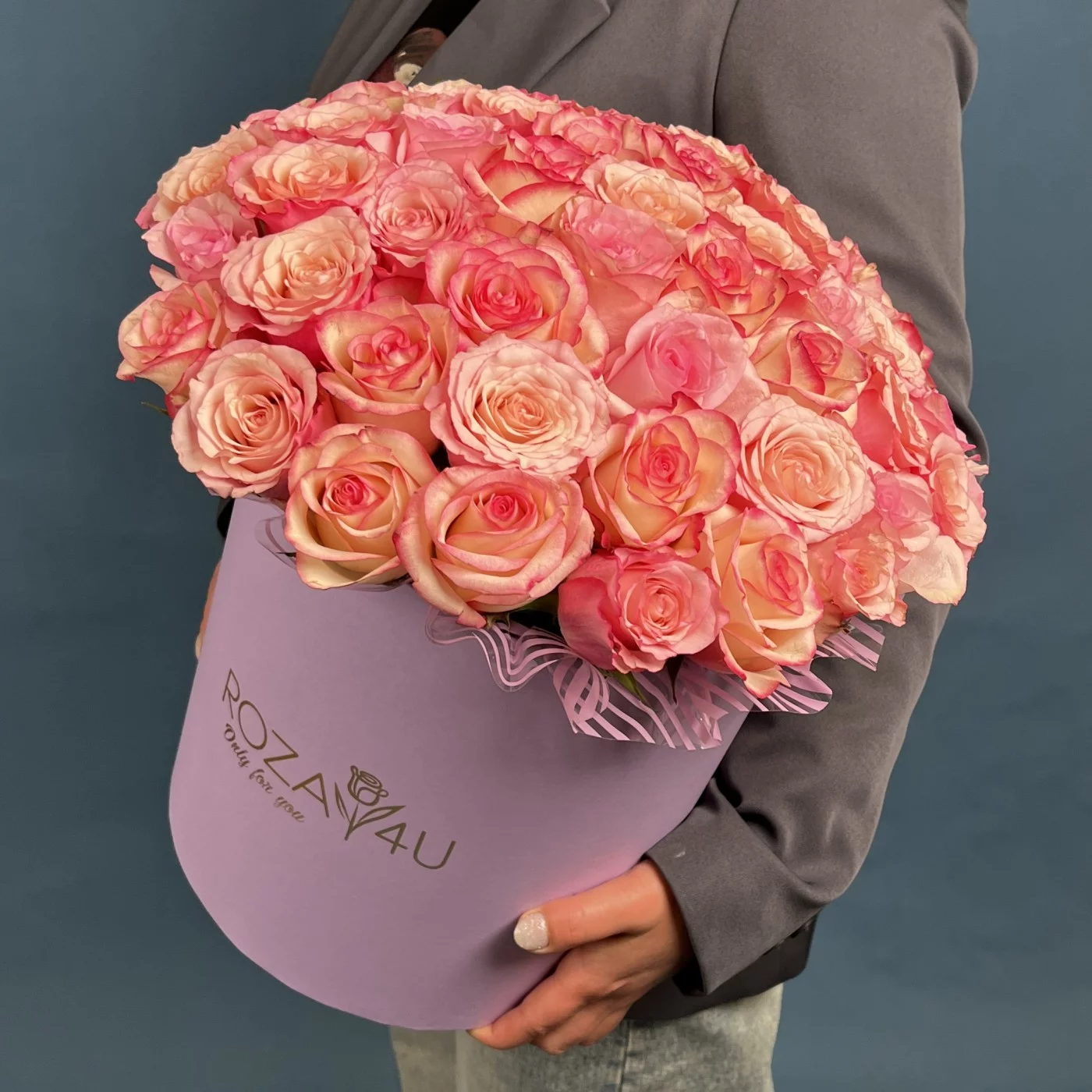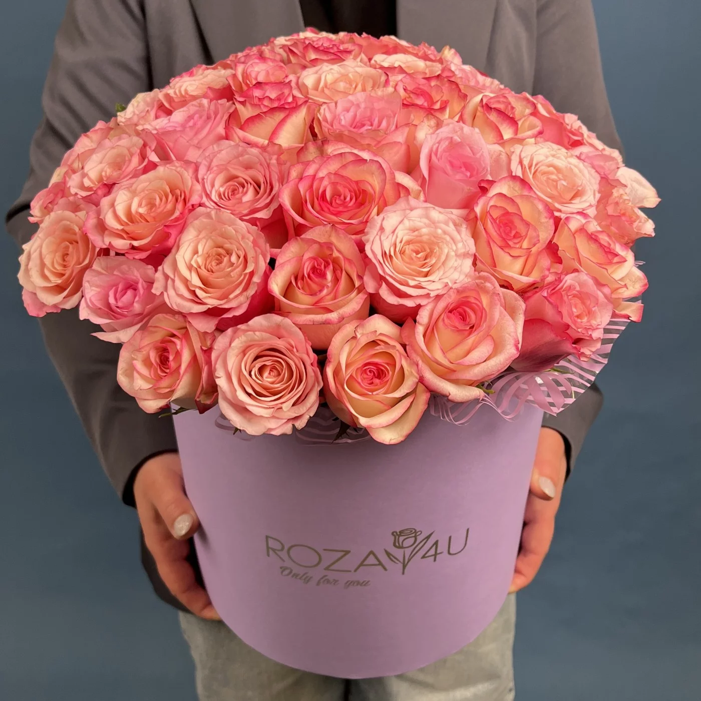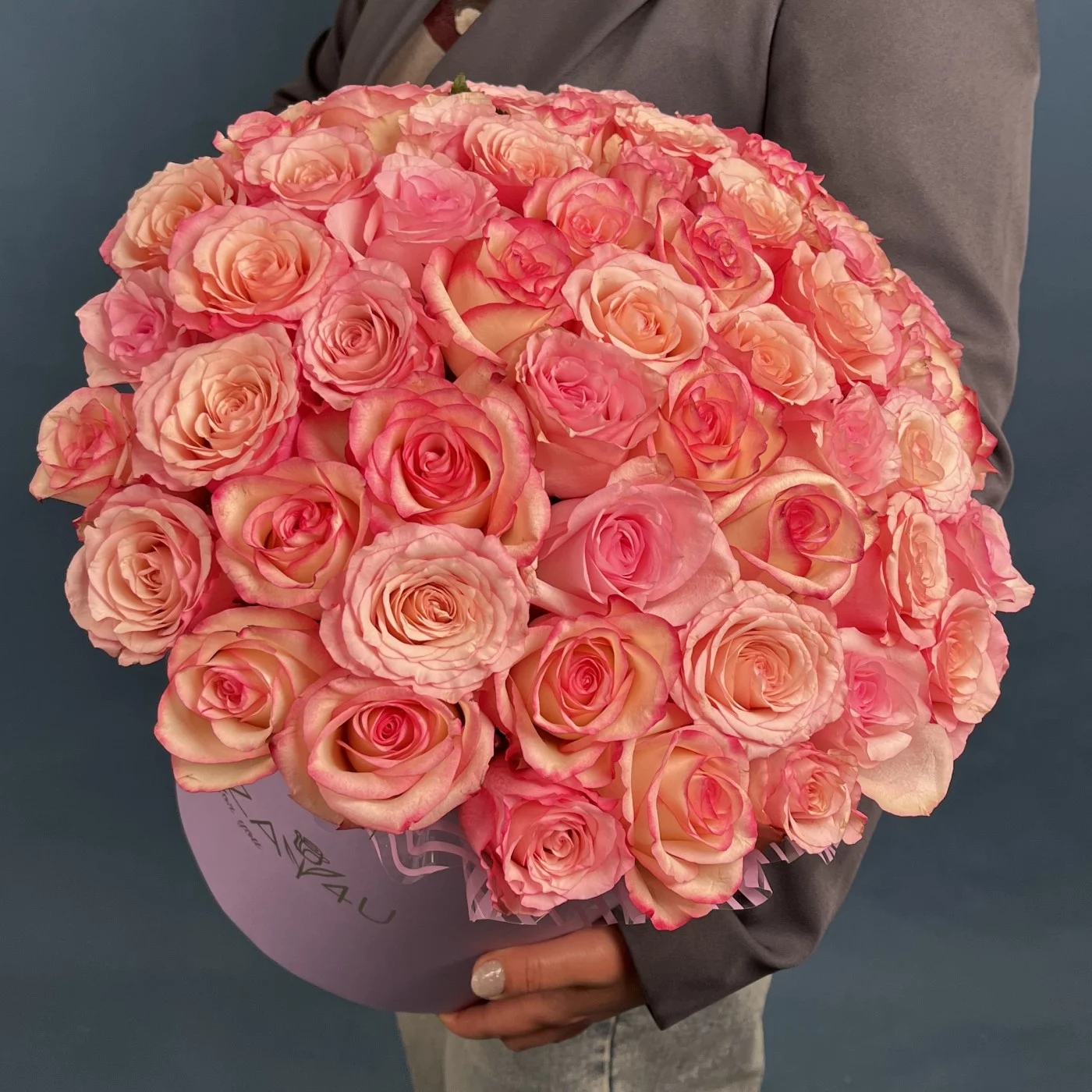 51 розовая роза Микс Алани в коробке — это изысканный и яркий подарок, который станет настоящим украшением любого торжества.