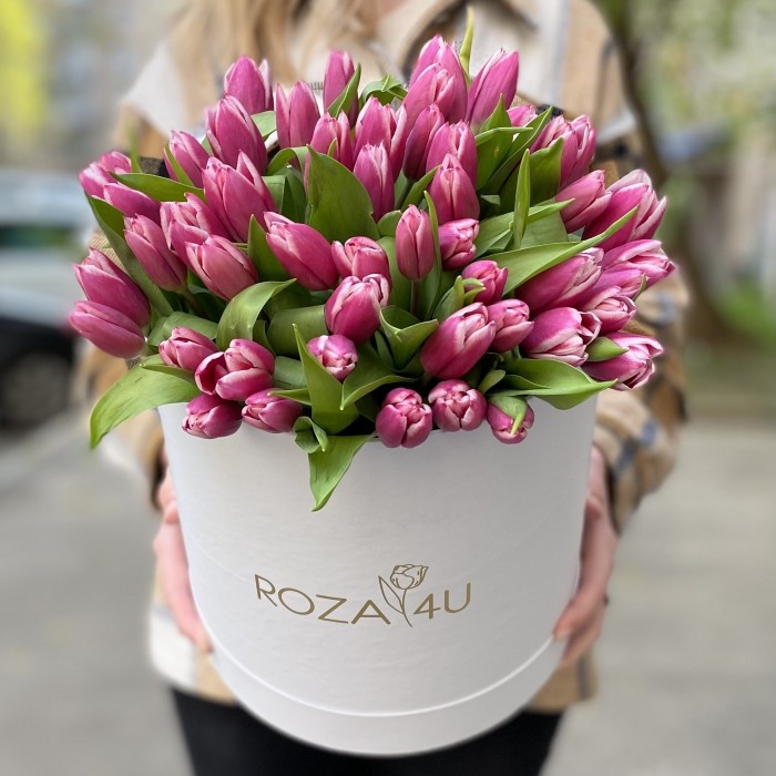 51 розово-белый тюльпан в коробке. Преподнесите такую композицию в качестве презента своим любимым людям. Прекрасный подарок к 8 марта.