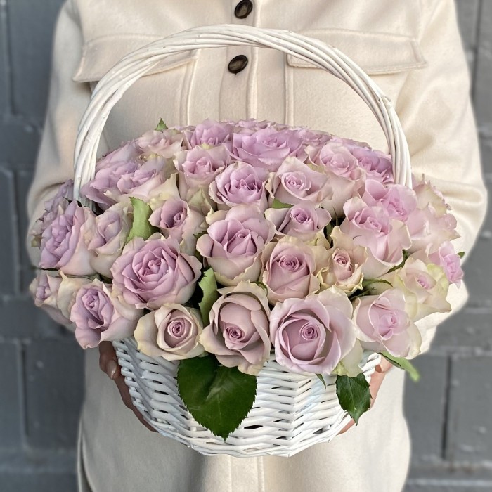 Композиция из 51 сиреневая роза Морнинг Дью в плетеной корзиночке. Замечательный подарок на свадьбу, юбилей!
