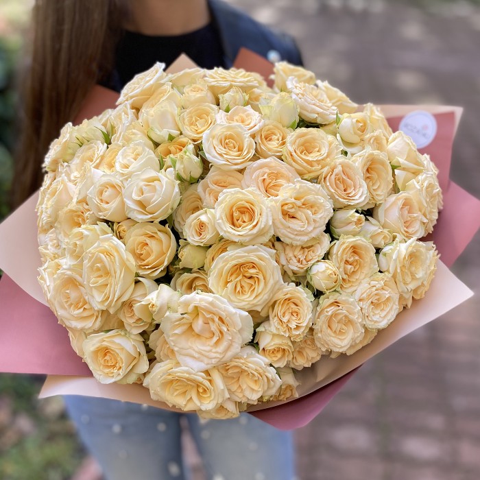 Монобукет из ароматных кустовых роз нежного кремового оттенка поражает объемом! Подарите букет из роз любимой женщине, коллеге или молодоженам на свадьбу и они точно останутся в восторге.