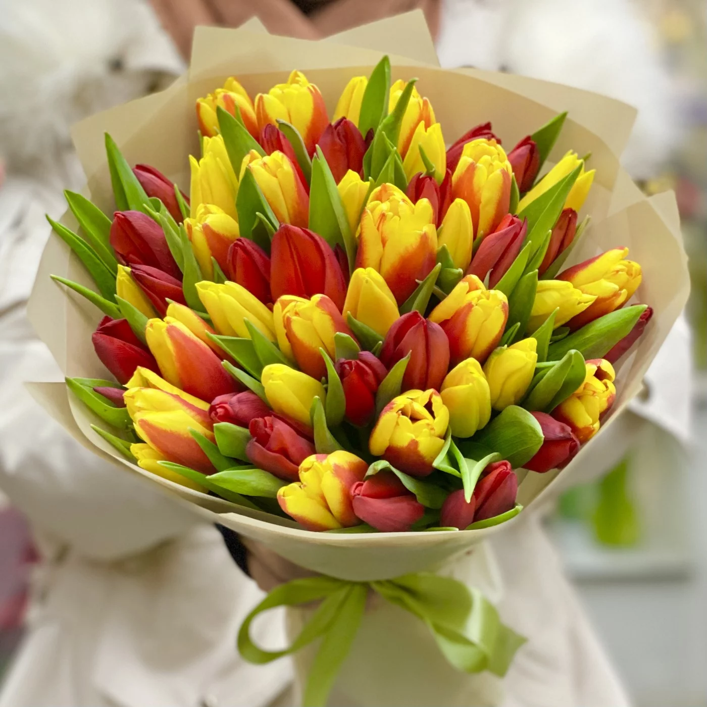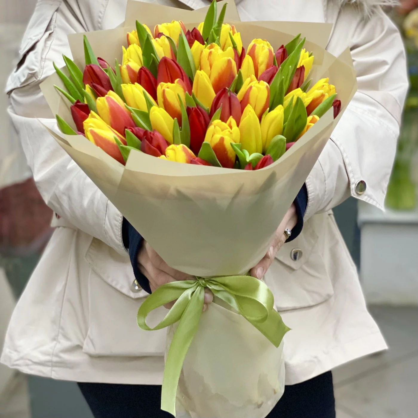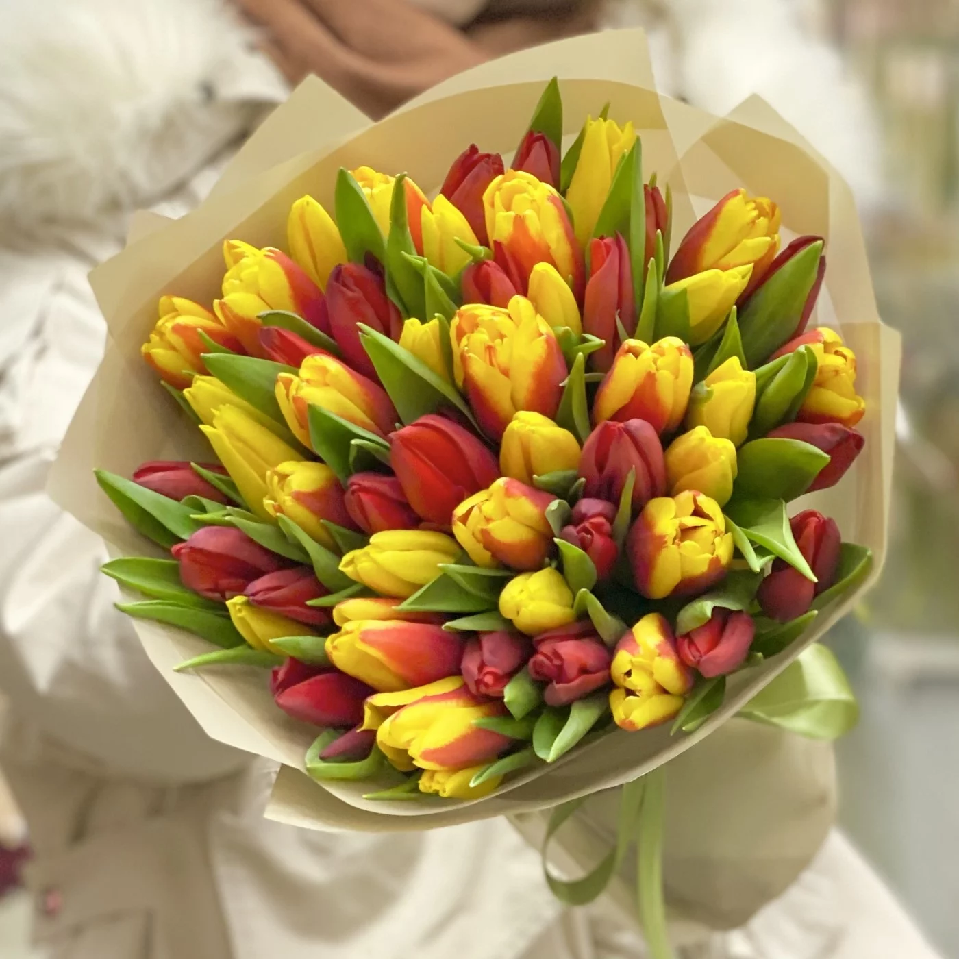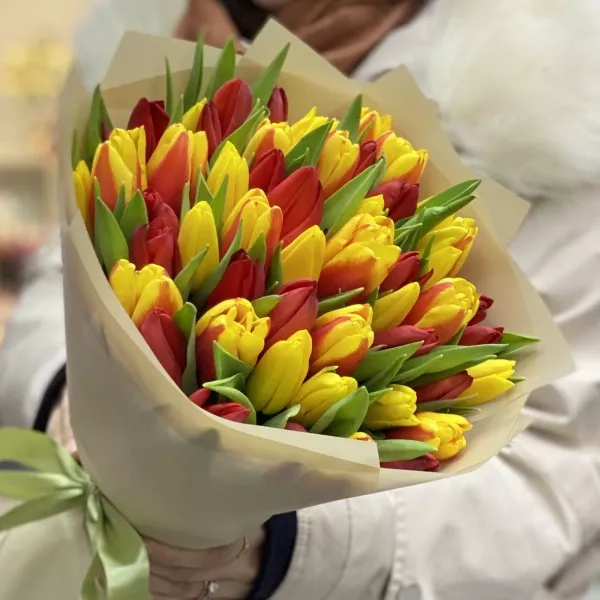 Элегантный ароматный букет из ярких тюльпанов с весёлым характером. Красные, жёлтые, красно-жёлтые цветы смотрятся по-весеннему живописно, завораживающе и позитивно. Однотонная упаковка ненавязчиво подчёркивает сочность бутонов и листьев. Такая цветочная композиция непременно поднимет настроение, подарит ни с чем несравнимую радость и настоящее счастье от приятного момента. Каждая женщина будет рада получить такой букет на 8 марта, свой День рождения и в любой обычный день.