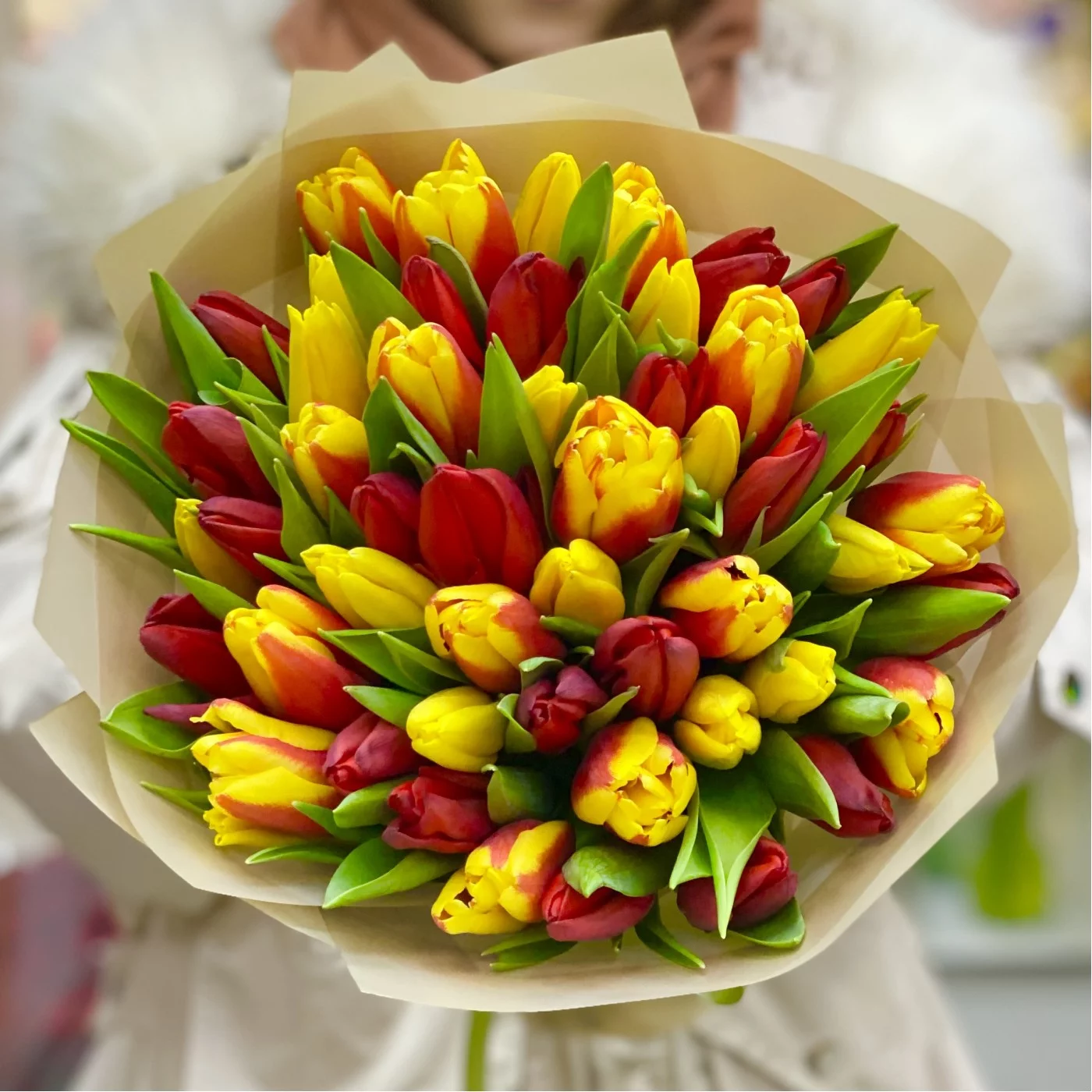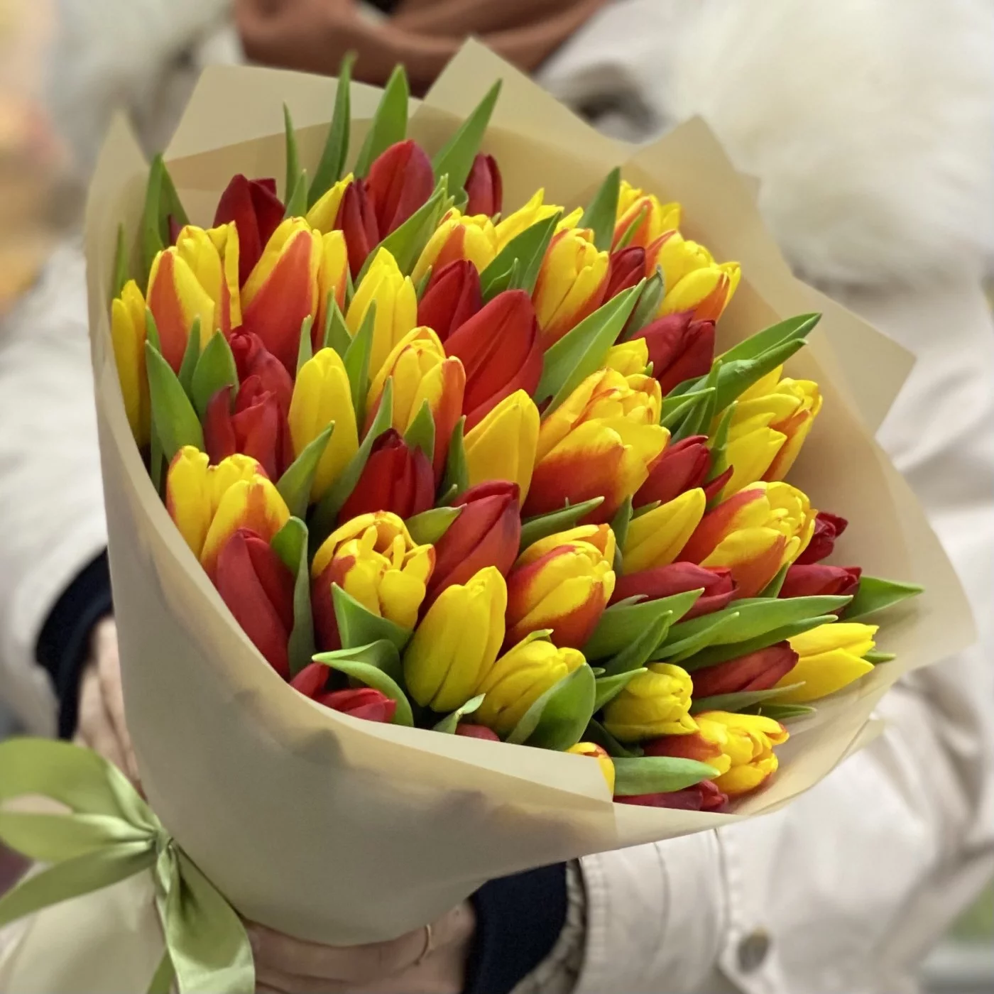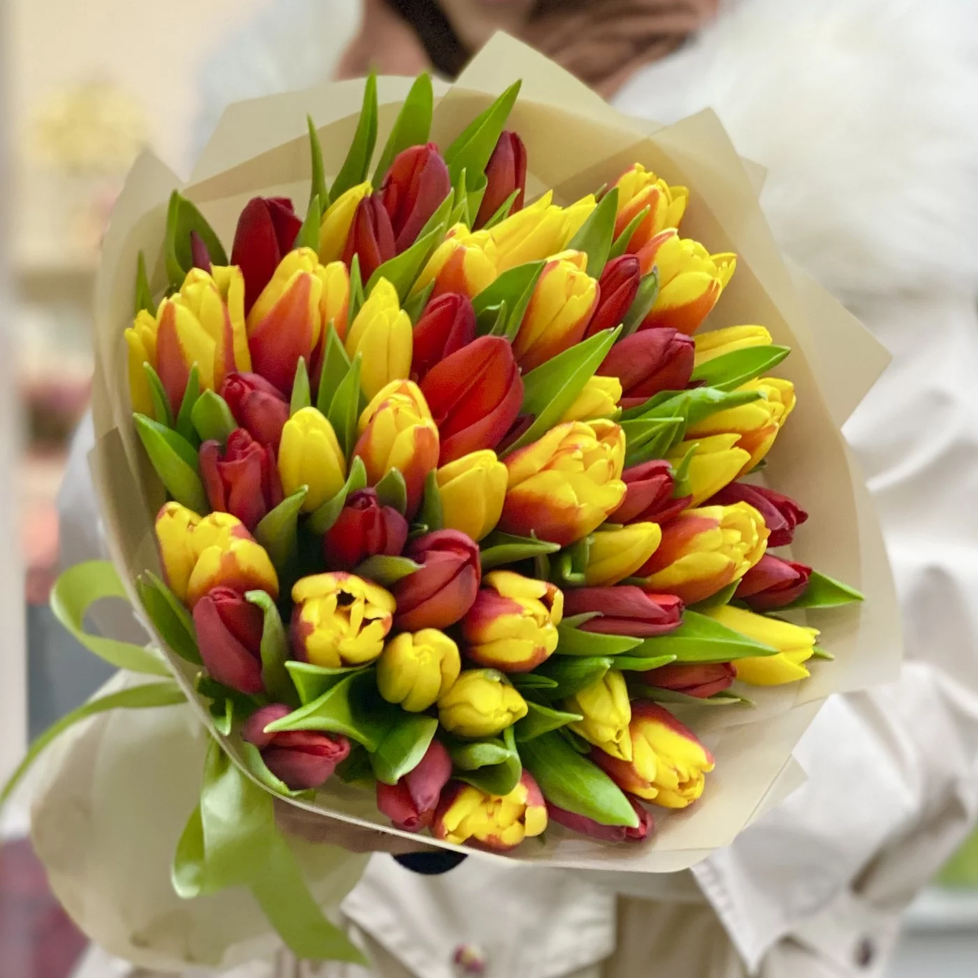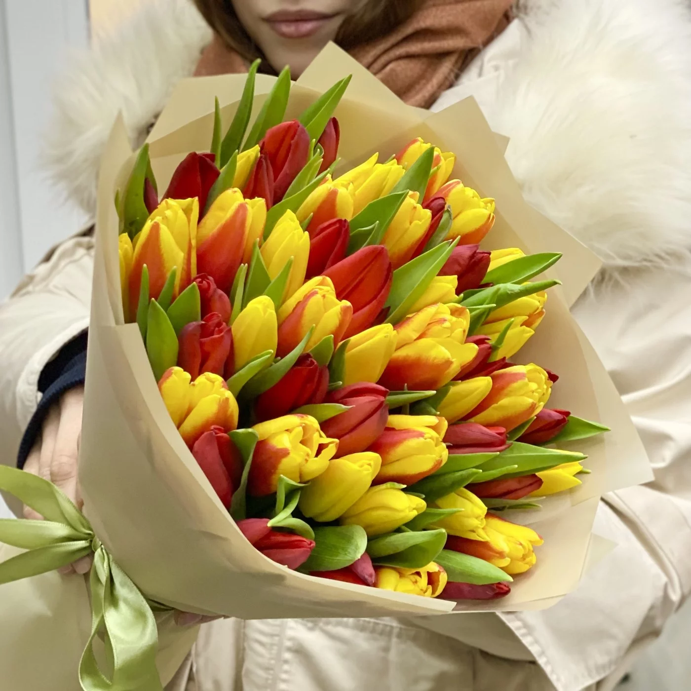 Элегантный ароматный букет из ярких тюльпанов с весёлым характером. Красные, жёлтые, красно-жёлтые цветы смотрятся по-весеннему живописно, завораживающе и позитивно. Однотонная упаковка ненавязчиво подчёркивает сочность бутонов и листьев. Такая цветочная композиция непременно поднимет настроение, подарит ни с чем несравнимую радость и настоящее счастье от приятного момента. Каждая женщина будет рада получить такой букет на 8 марта, свой День рождения и в любой обычный день.