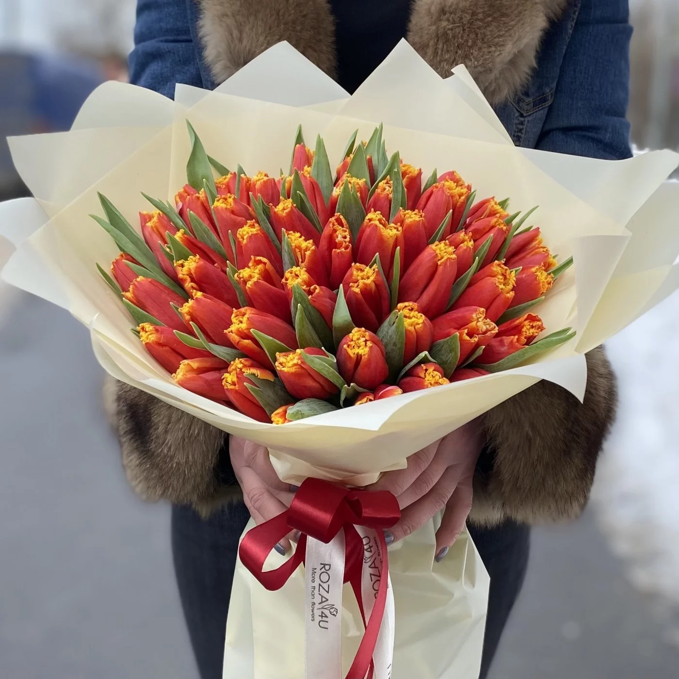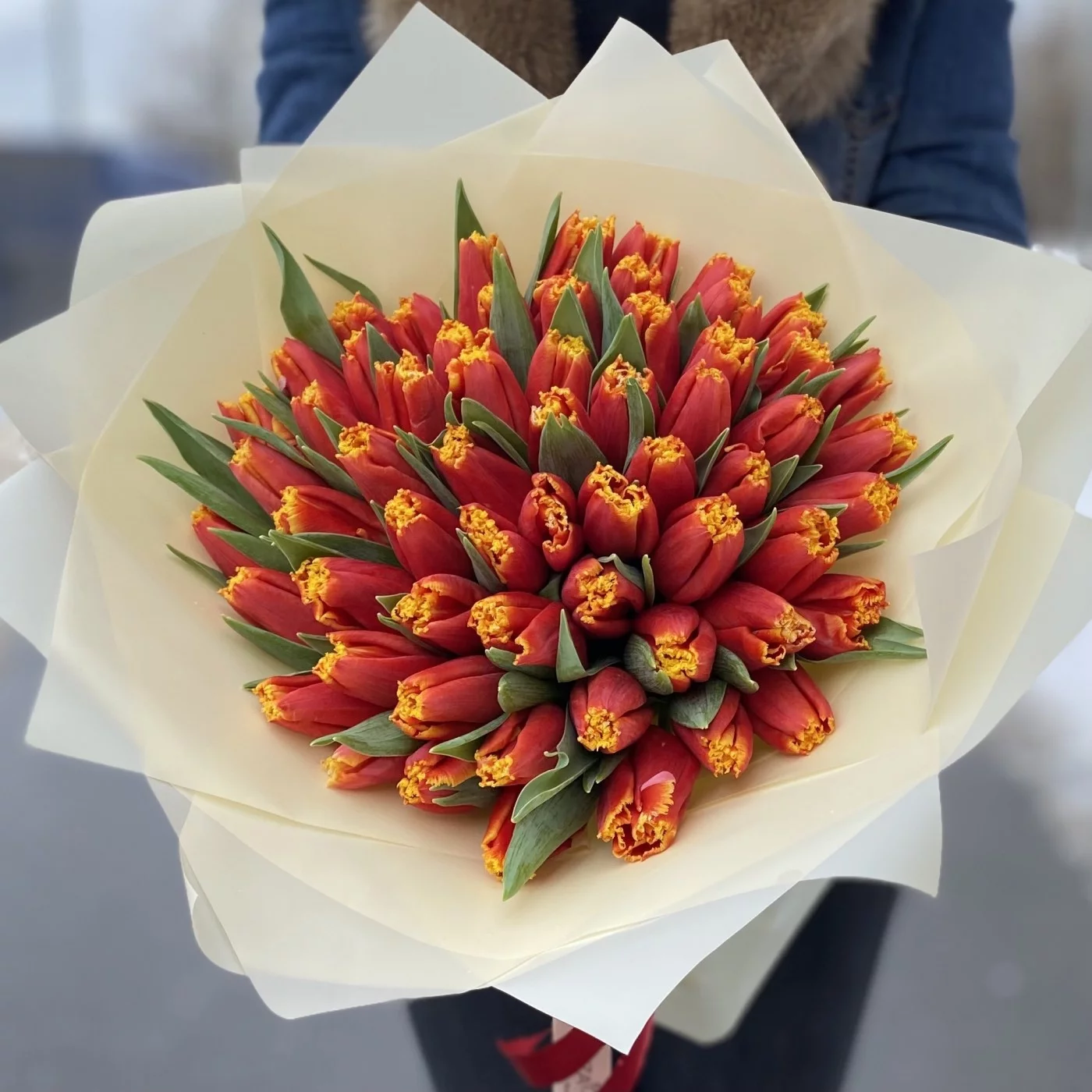 Яркий букет из 51 тюльпана. прекрасный подарок на 8 марта или день рождения.