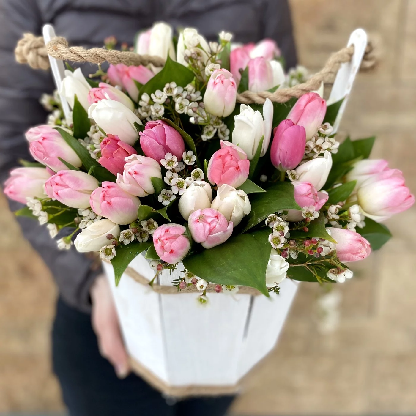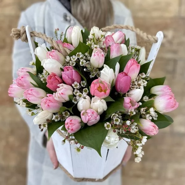 Деревянное кашпо с тюльпанами удивит получательницу, создаст особенное настроение, а само кашпо можно использовать в дальнейшем в качестве декора или предмета хранения. Композиция помещена в специальную флористическую губку, которую необходимо поливать 1 раз в 2 дня в нескольких местах.