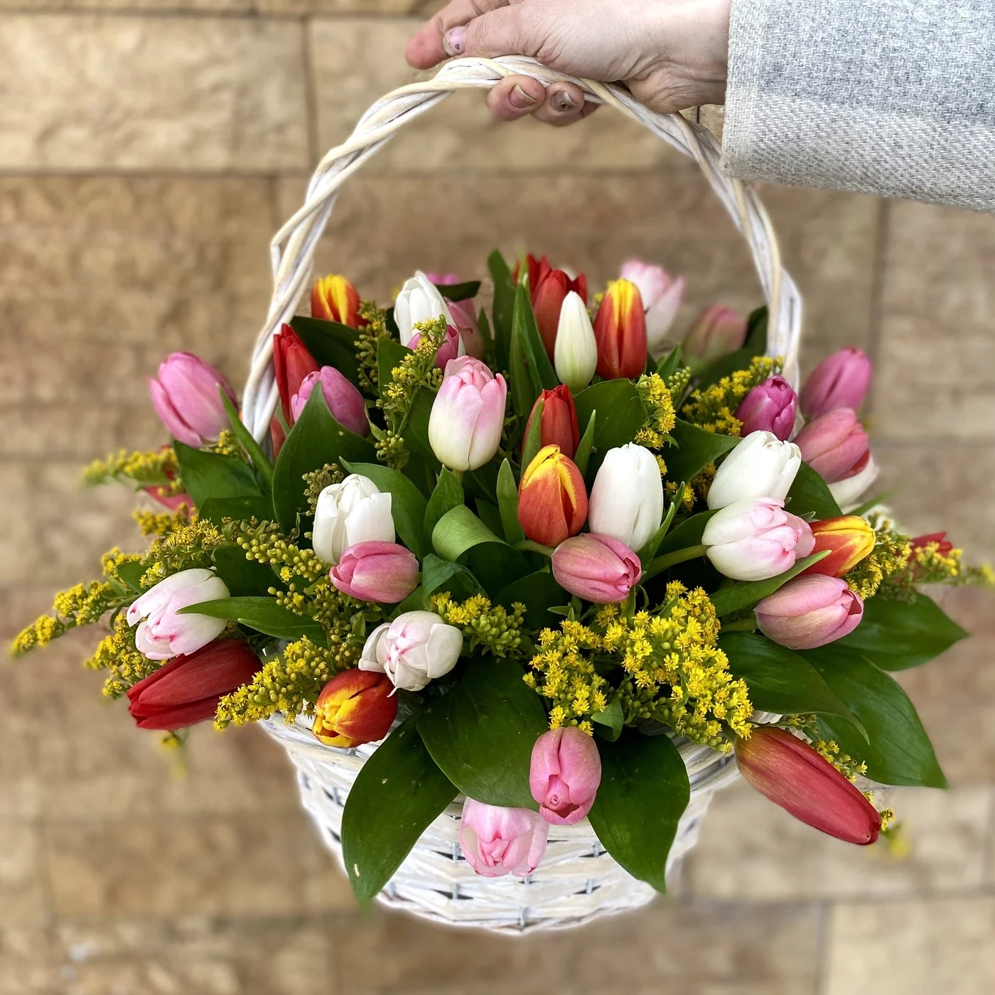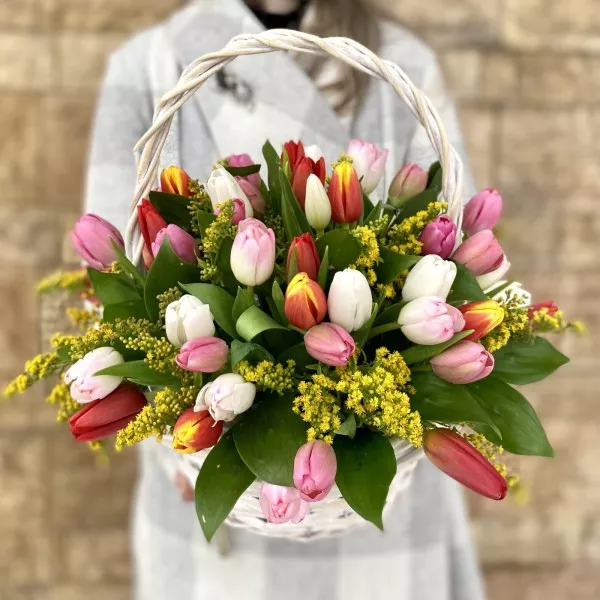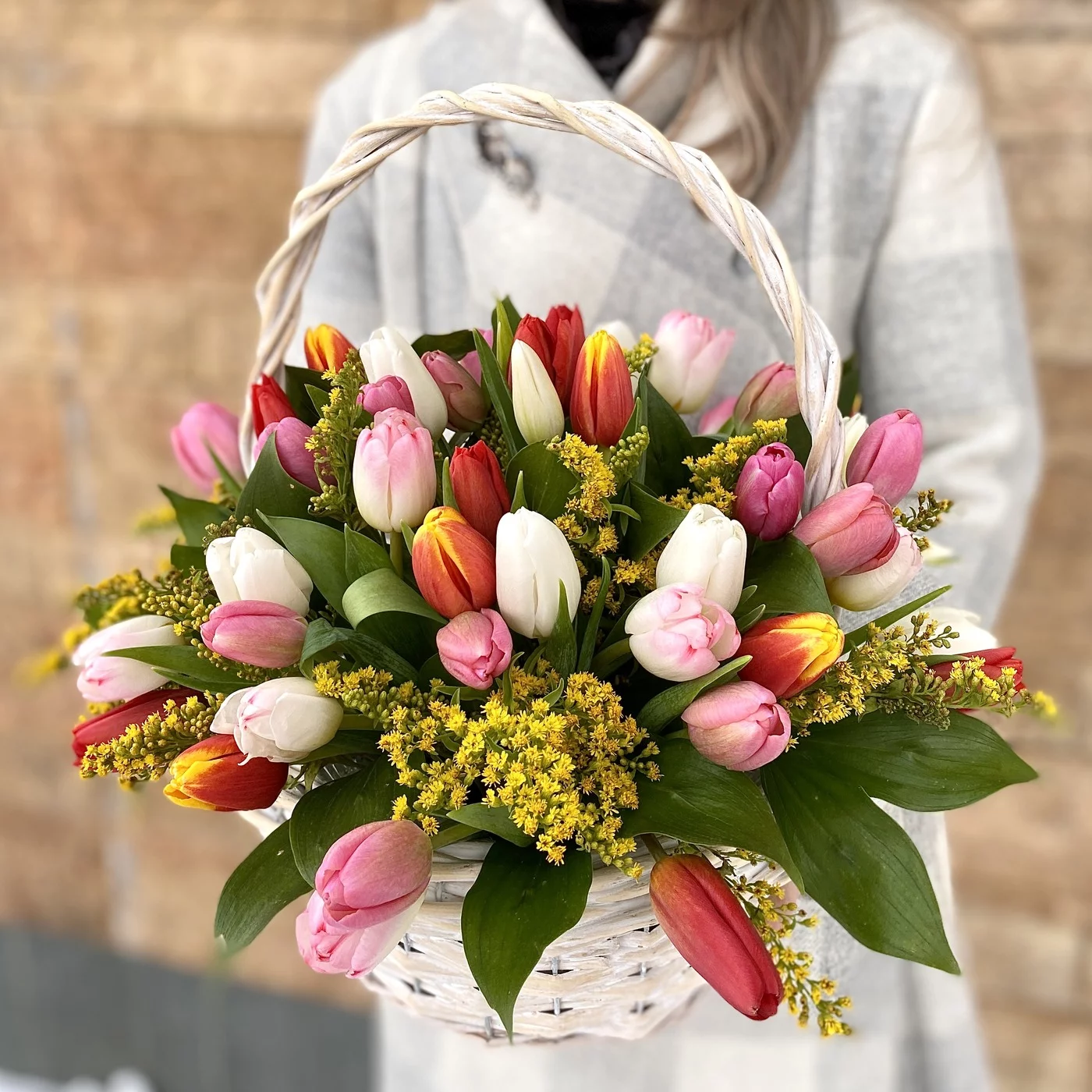 Корзина с тюльпанами создана, чтобы радовать женщин не только в Междунарожный женский день, но и в любой другой. Наполните дом светом и ароматом яркой, солнечной композиции в белой корзине.