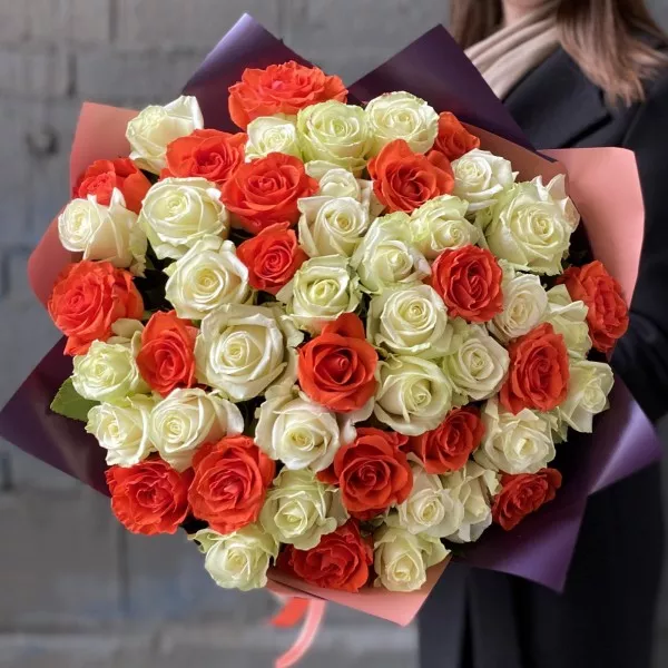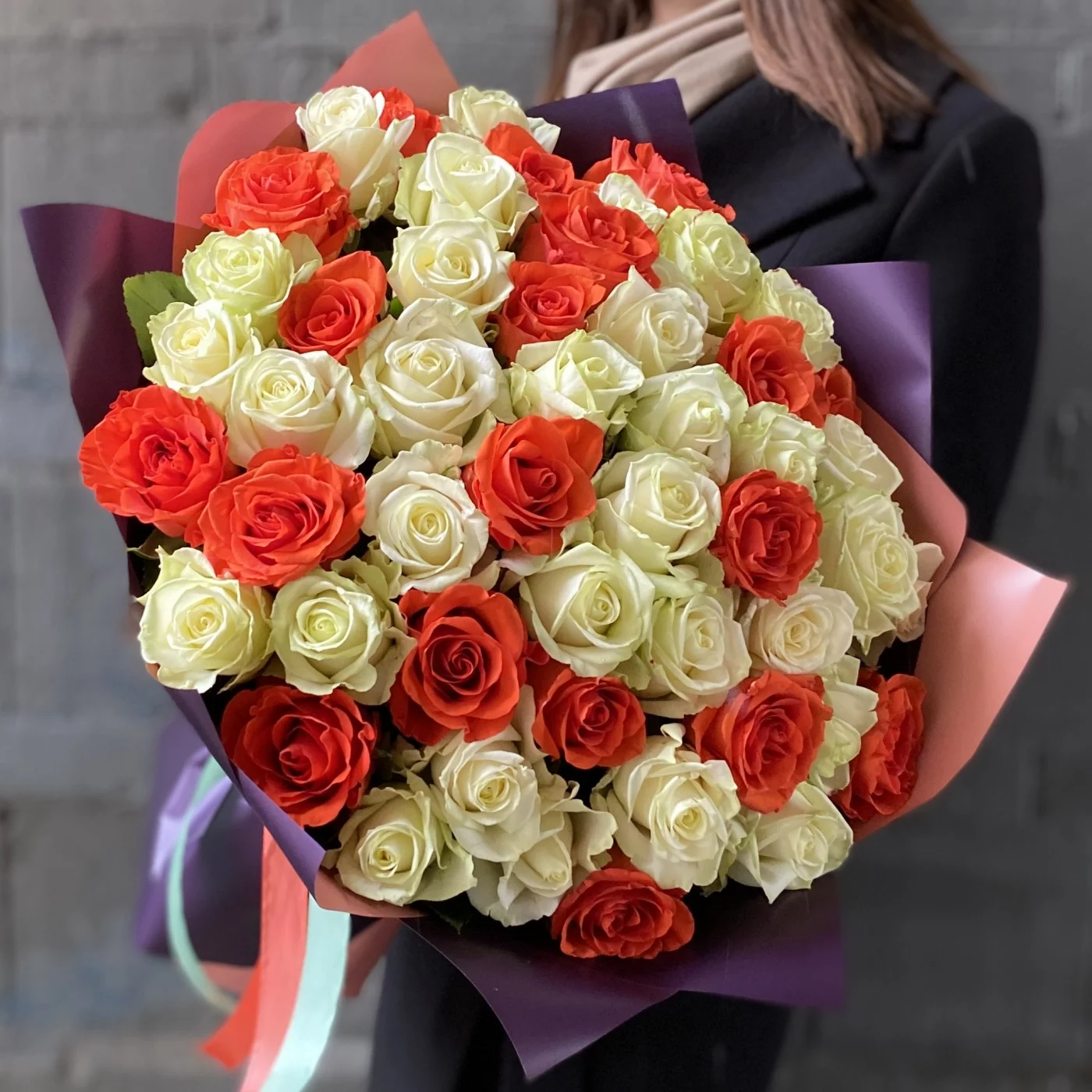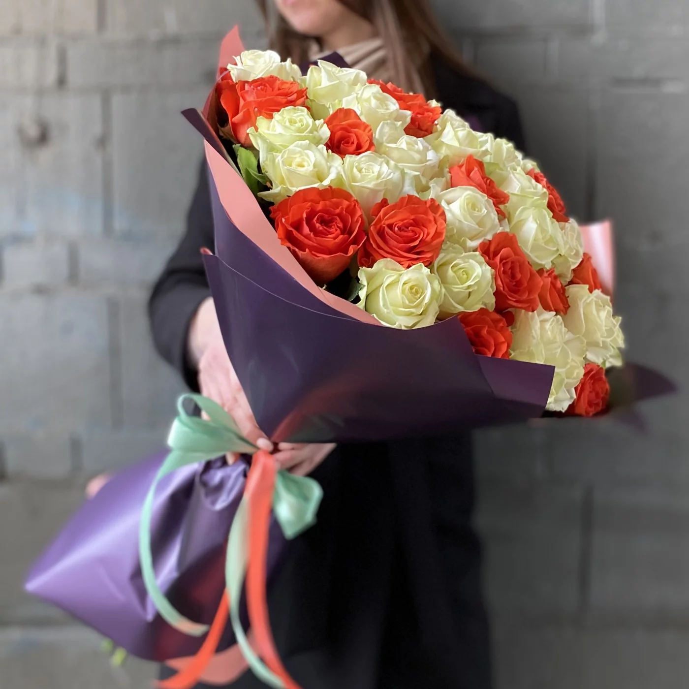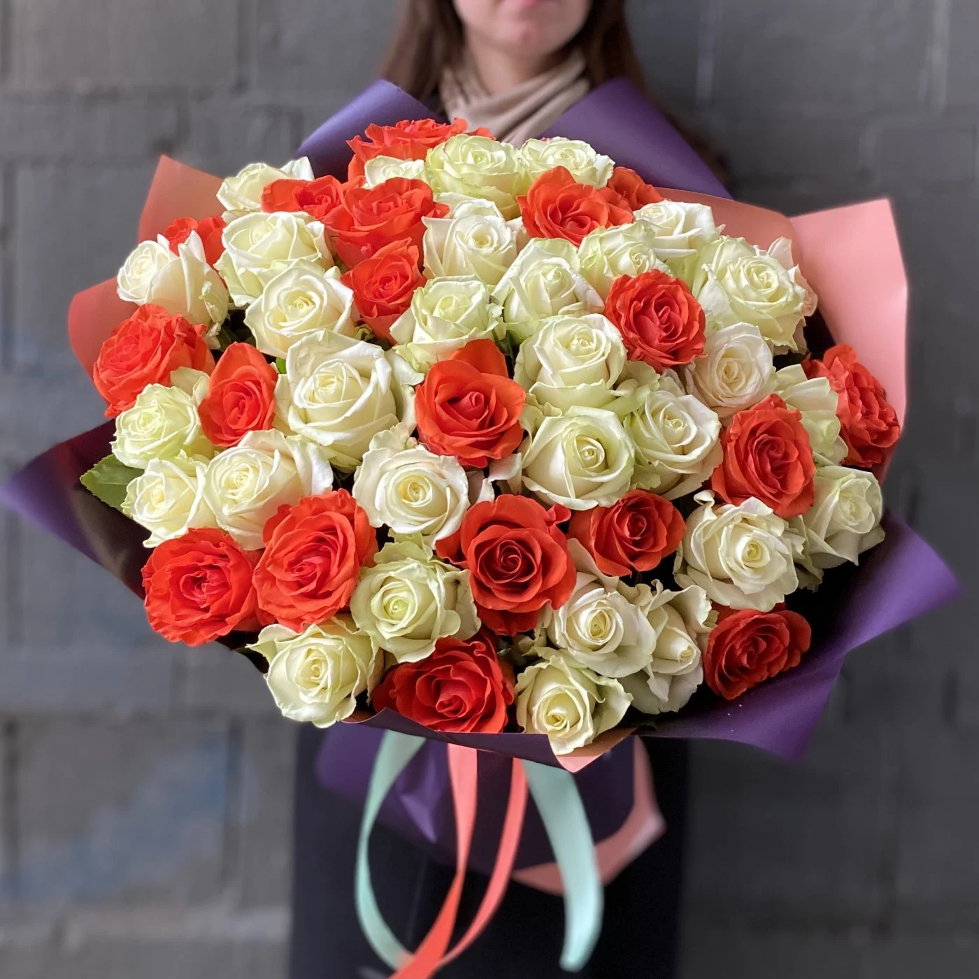 Большой праздничный букет из ярких оранжевых и нежных белых роз. Торжественное и красивое сочетание роз. Прекрасный вариант для любых мероприятий.