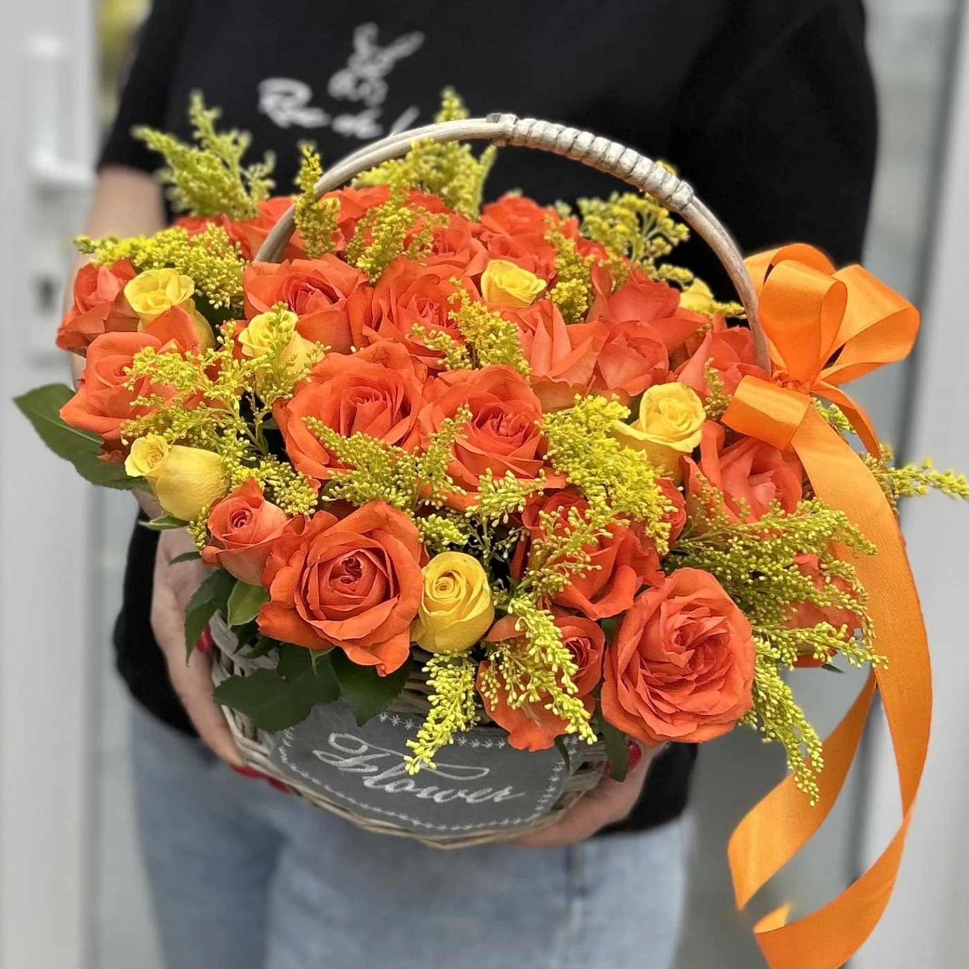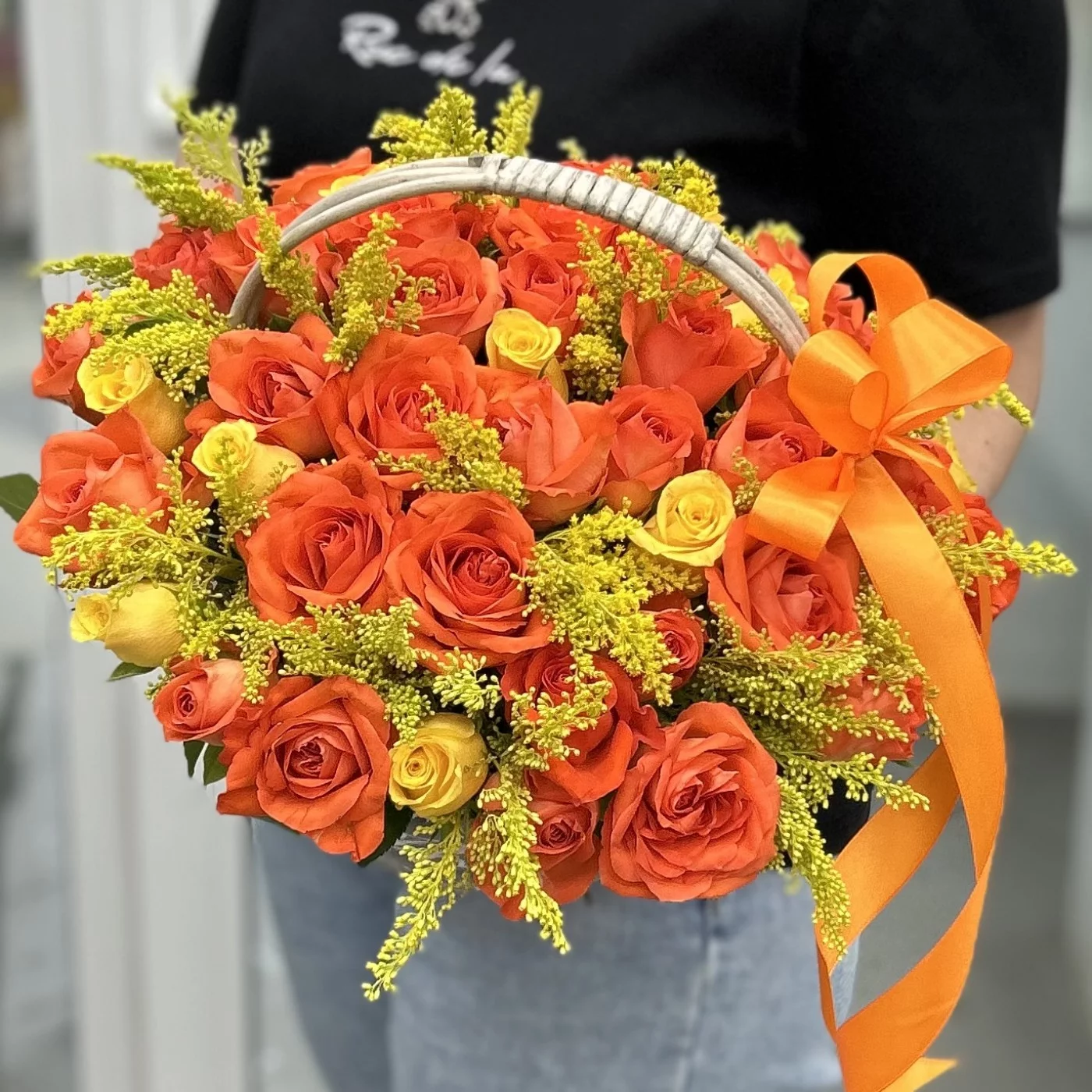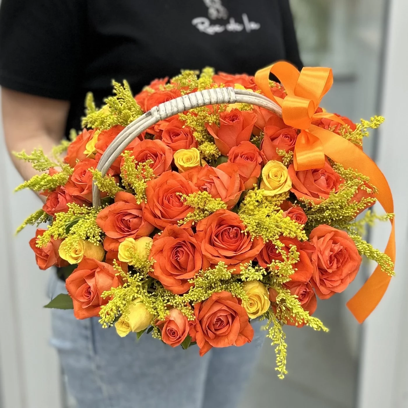 Композиция из 51 жёлтой и оранжевой розы с солидаго в корзине — это яркое воплощение солнечного настроения и тёплой энергии. Насыщенные оттенки роз создают живую игру света, а нежные веточки солидаго подчёркивают их сияние, добавляя лёгкости и природной свежести. В корзине такая композиция выглядит особенно гармонично: объёмная, светлая, она создаёт ощущение тепла и радости, будто приносит с собой частичку солнечного дня. Это идеальный подарок для тех, кому вы хотите подарить хорошее настроение — для любимого человека, мамы, коллеги, учителя или друга. Композиция уместна на день рождения, юбилей, поздравление с достижением или просто как знак искренней благодарности. Мы осуществляем доставку по Москве и области круглосуточно, гарантируем отличное качество и свежесть цветов. У нас лучшие цены и прекрасные отзывы во всех поисковиках, ведь каждую композицию мы создаём с вниманием, любовью и профессионализмом.