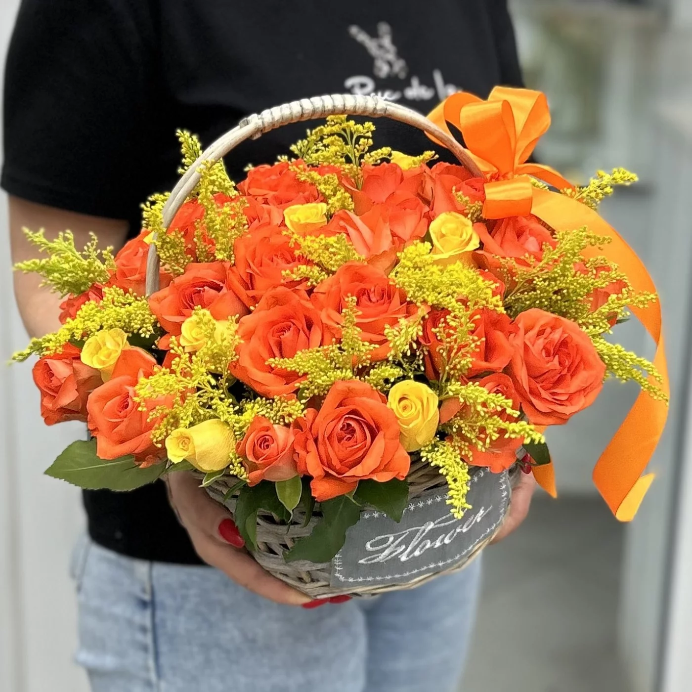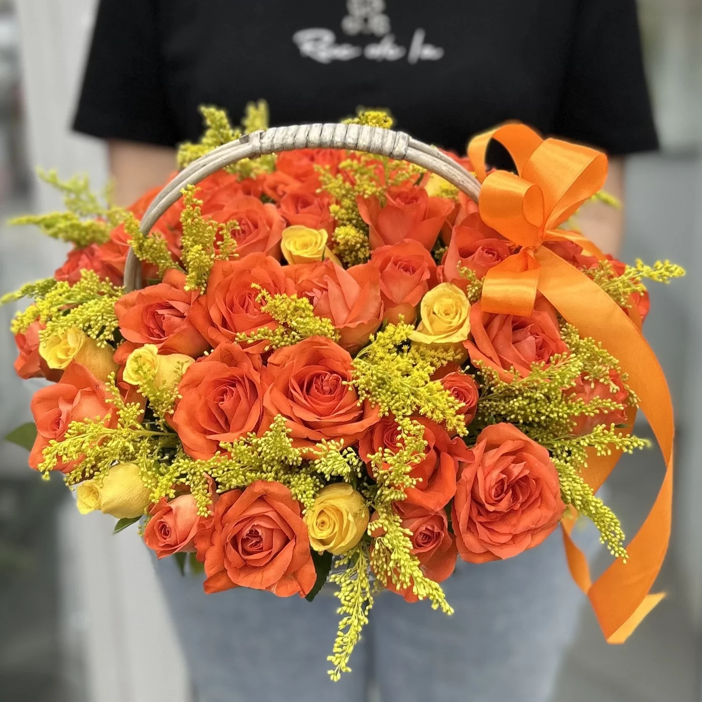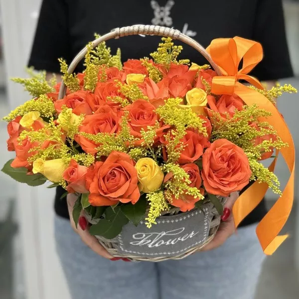 Композиция из 51 жёлтой и оранжевой розы с солидаго в корзине — это яркое воплощение солнечного настроения и тёплой энергии. Насыщенные оттенки роз создают живую игру света, а нежные веточки солидаго подчёркивают их сияние, добавляя лёгкости и природной свежести. В корзине такая композиция выглядит особенно гармонично: объёмная, светлая, она создаёт ощущение тепла и радости, будто приносит с собой частичку солнечного дня. Это идеальный подарок для тех, кому вы хотите подарить хорошее настроение — для любимого человека, мамы, коллеги, учителя или друга. Композиция уместна на день рождения, юбилей, поздравление с достижением или просто как знак искренней благодарности. Мы осуществляем доставку по Москве и области круглосуточно, гарантируем отличное качество и свежесть цветов. У нас лучшие цены и прекрасные отзывы во всех поисковиках, ведь каждую композицию мы создаём с вниманием, любовью и профессионализмом.