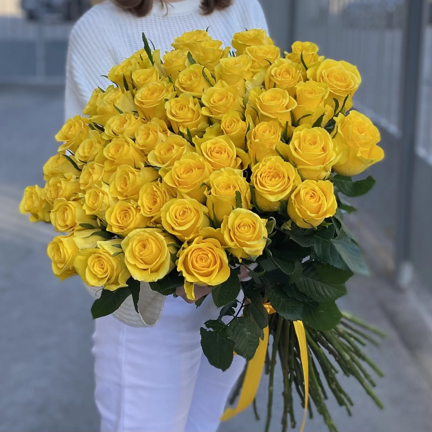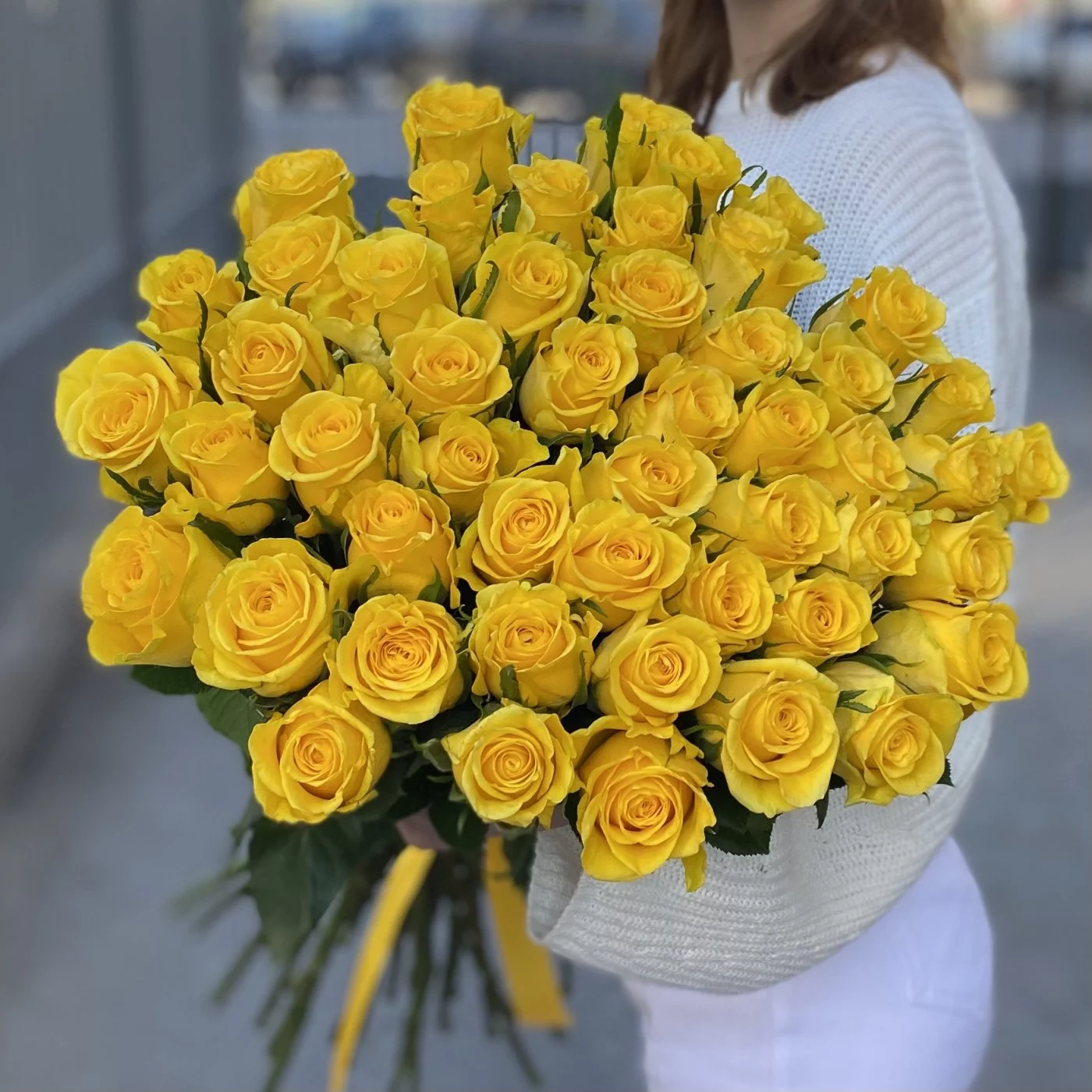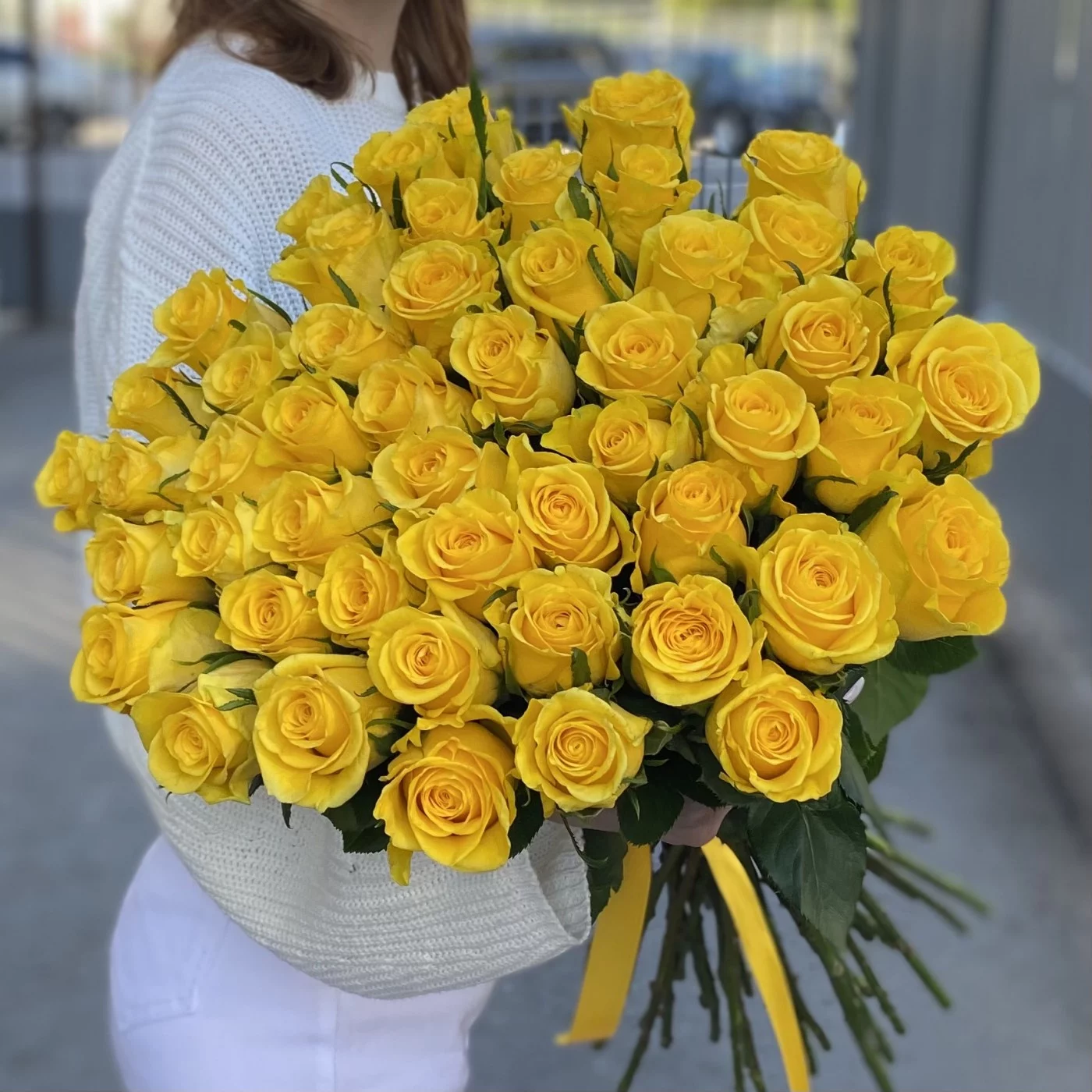 Букет из 51 высокой желтой розы Хай Еллоу с красивым крупным бутоном.