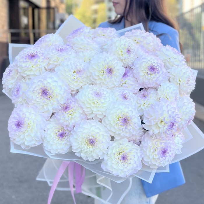 Георгины в этом букете обладают нежными белыми и сиреневыми оттенками, что добавляет легкости и романтики.