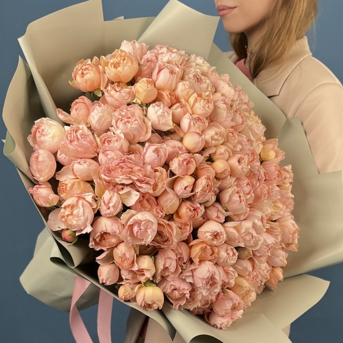 Букет из 51 кустовой пионовидной розы сорта Джульетта Хани высотой 40 см — это поистине роскошная и впечатляющая композиция, которая станет ярким акцентом на любом мероприятии.
