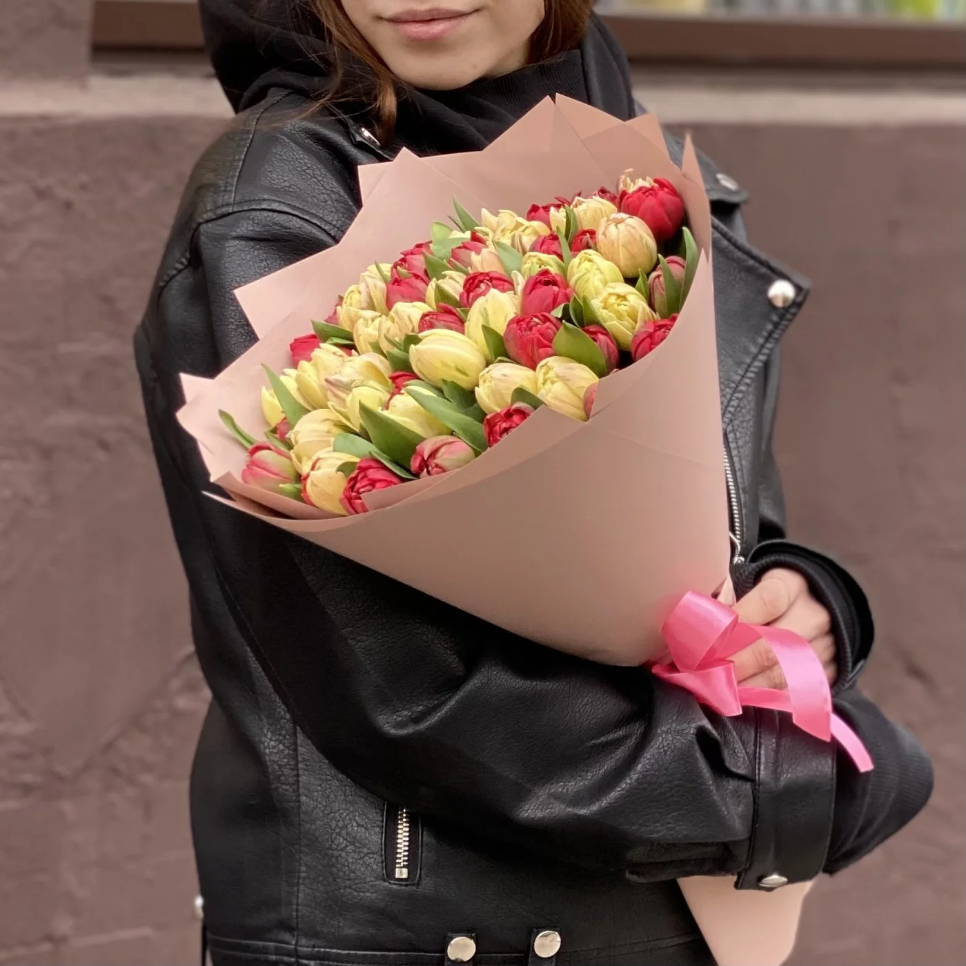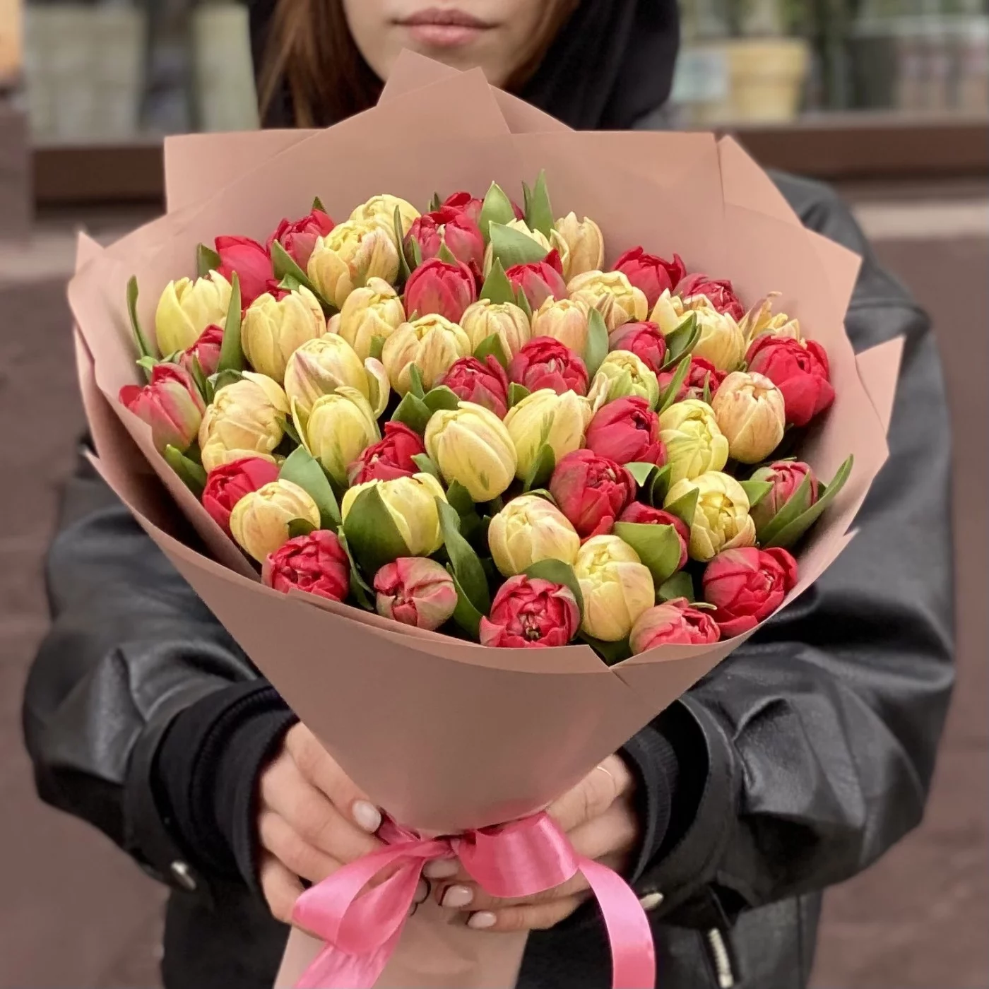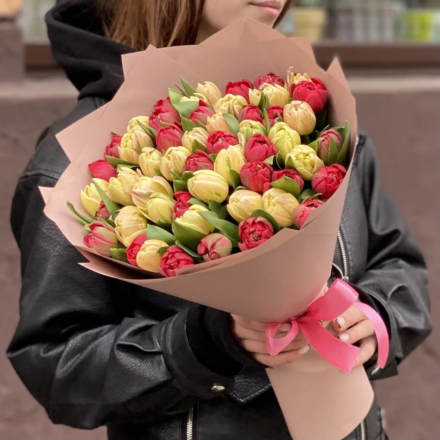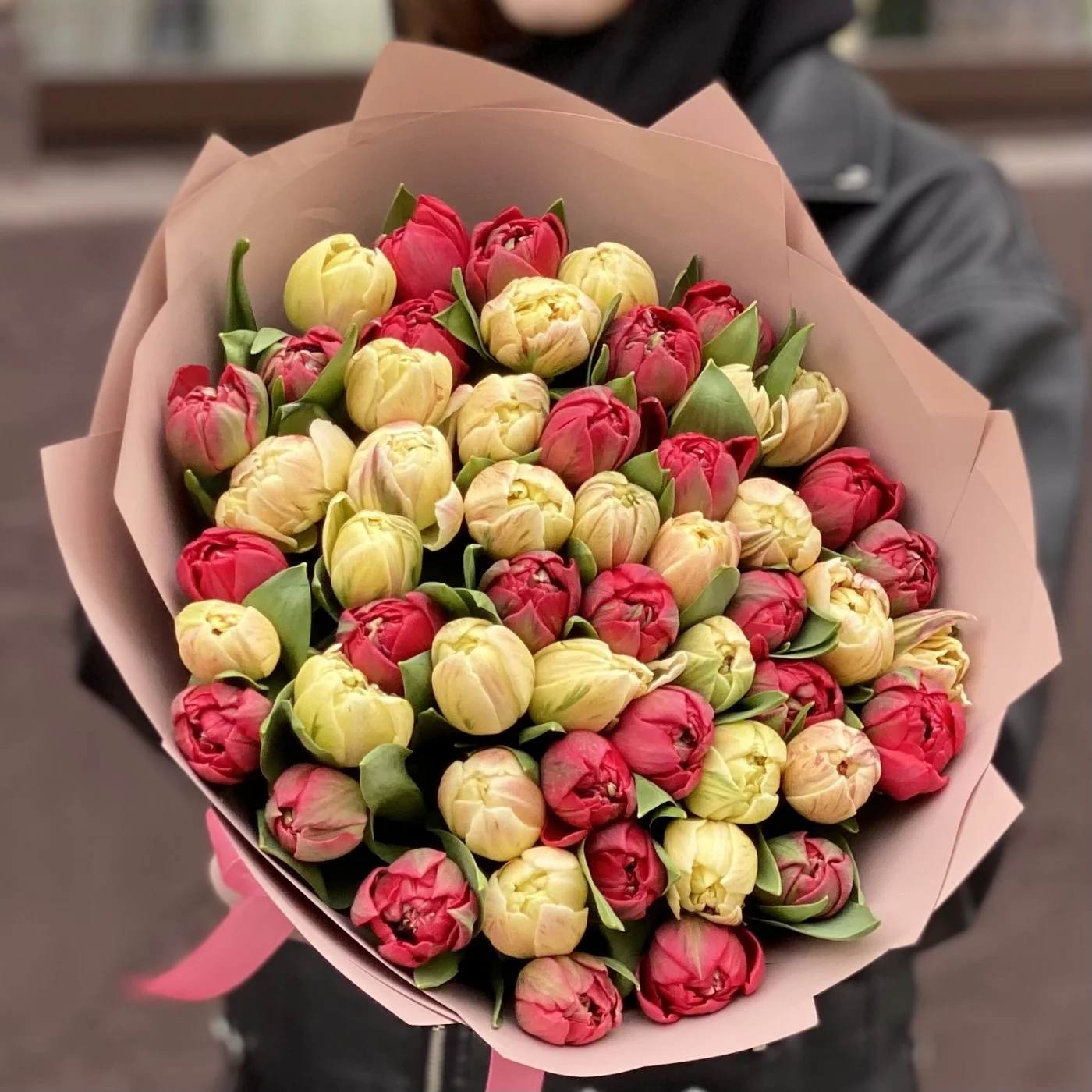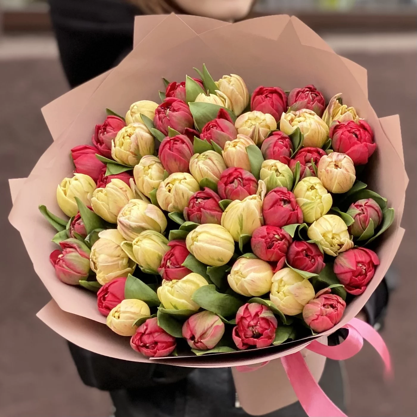 Пионовидные тюльпаны — новый тренд во флористике, они успели обрести популярность и найти своих поклонников. Такие цветы удачно сочетают в себе легкость тюльпанов и воздушность округлых пионов. В этом букете мы совместили два сорта цветов яркого красного и нежного кремового оттенков. Учитывая количество бутонов — а их здесь 51 — композиция получилась величественной, роскошной и в то же время элегантной.