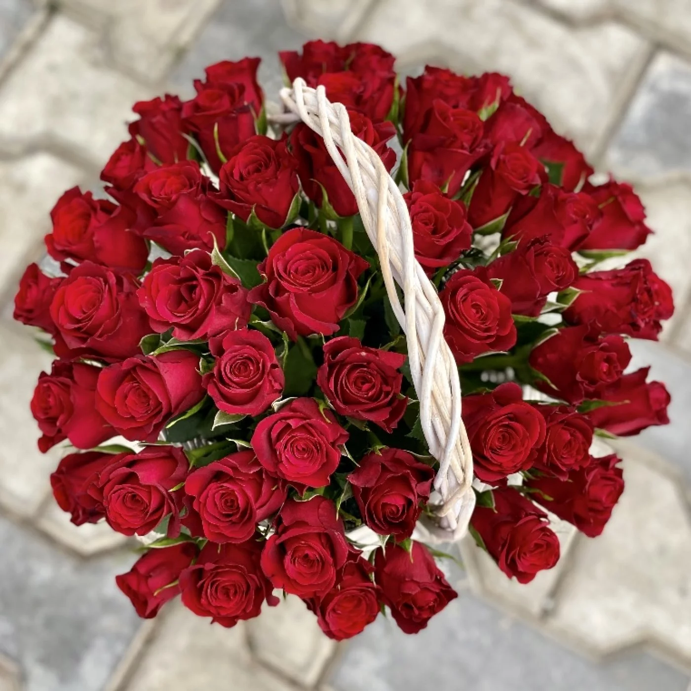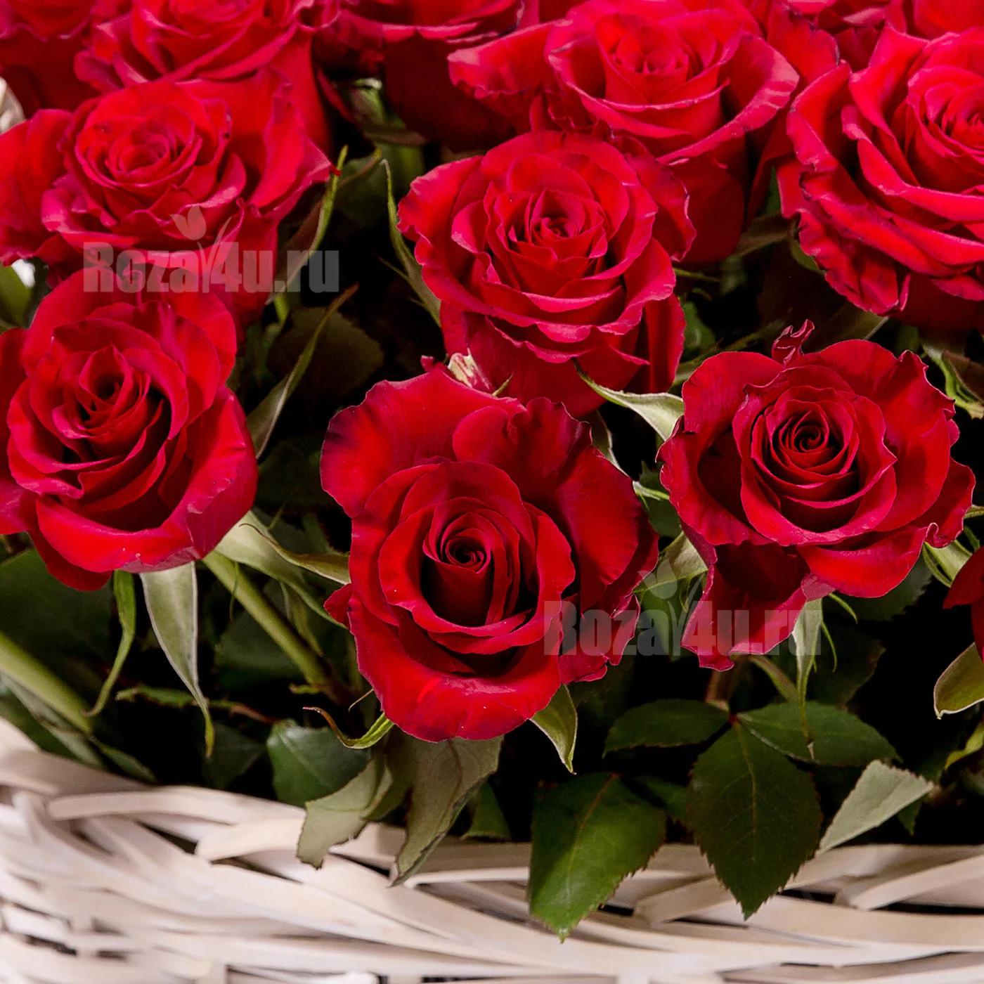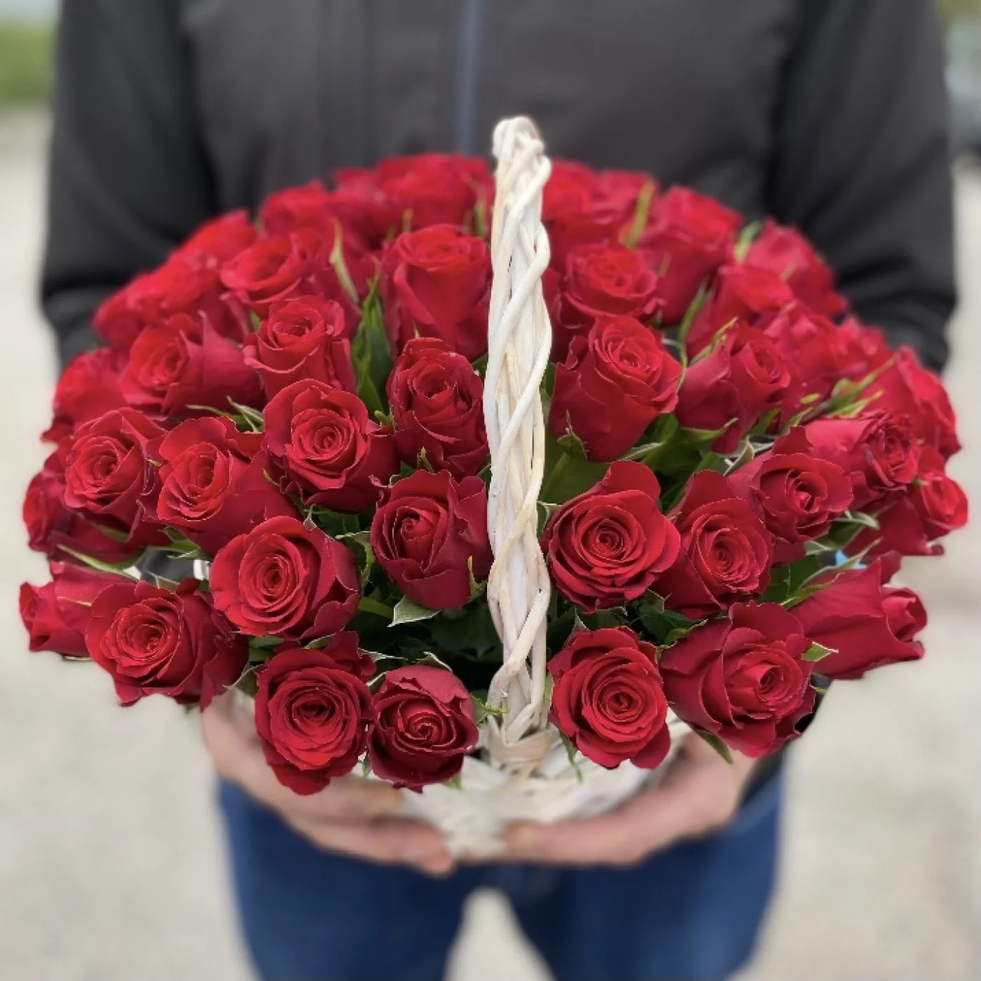 Состав композиции на фото: 51 красная роза, корзина из натуральных материалов. Можно выбрать другое количество роз в корзине.