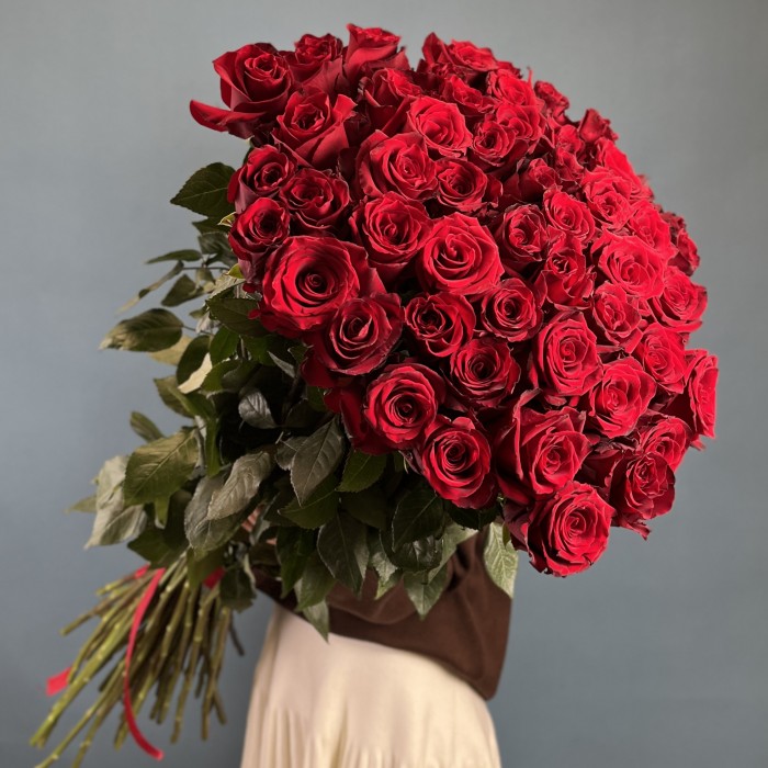 Букет из 55 красных роз высотой 100 см — это великолепный и выразительный выбор, который станет настоящим символом любви и восхищения. Такой букет не только привлекает внимание своим ярким цветом и ароматом, но и создает атмосферу романтики и элегантности на любом мероприятии или особом событии.