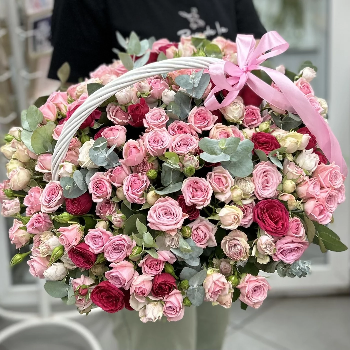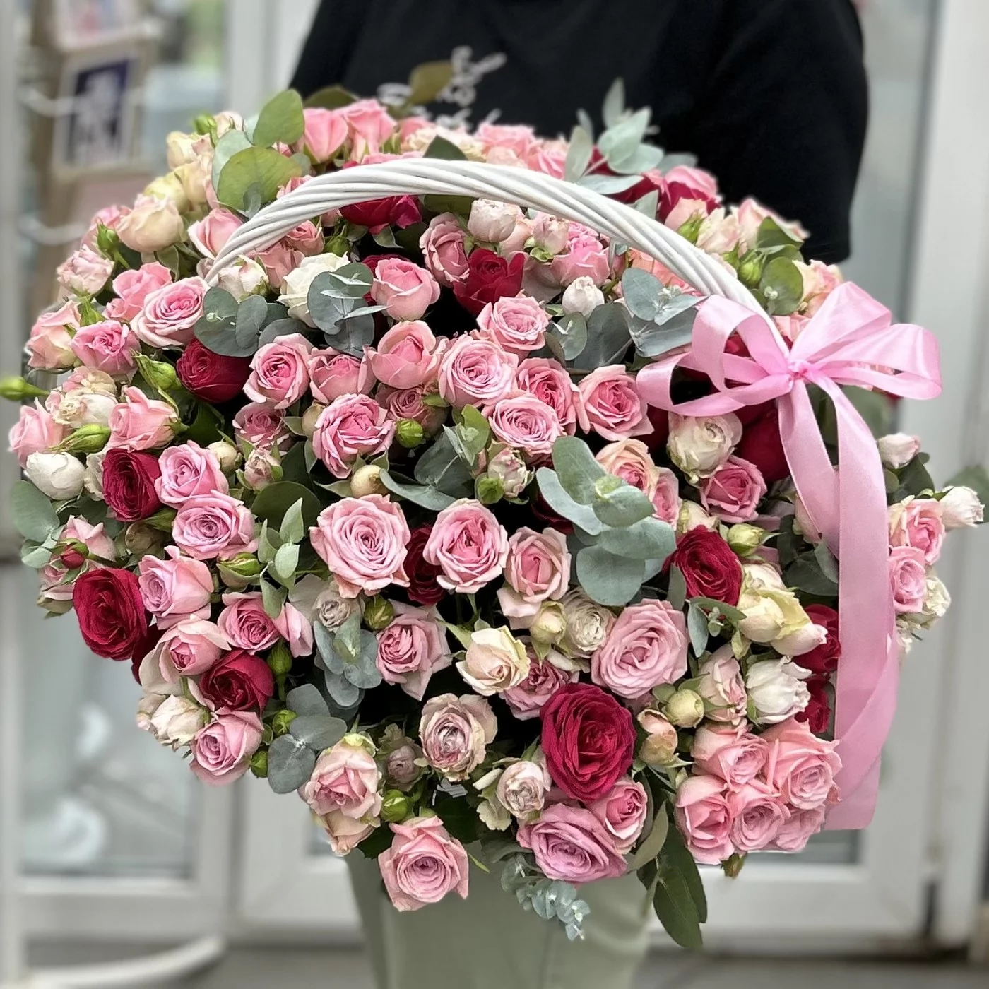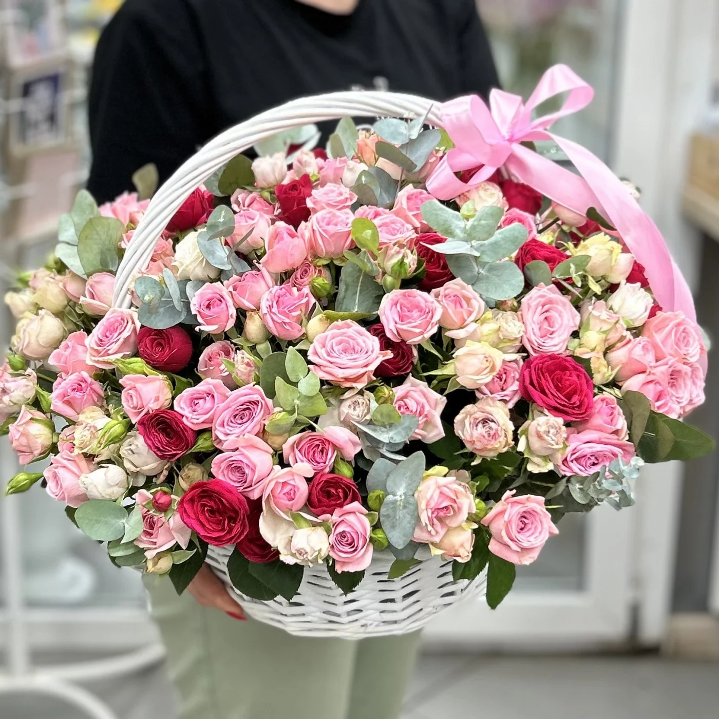 Большой Микс из кустовых роз в корзине, в состав входят розы разных сортов.
