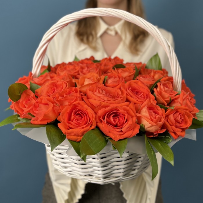 Великолепная корзина с 65 кустовыми розами насыщенного оранжевого цвета — это яркое и торжественное поздравление, наполненное энергией и теплом.