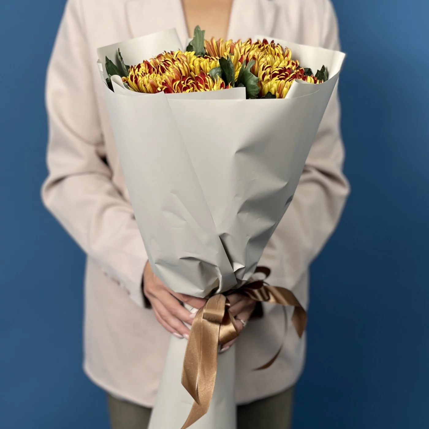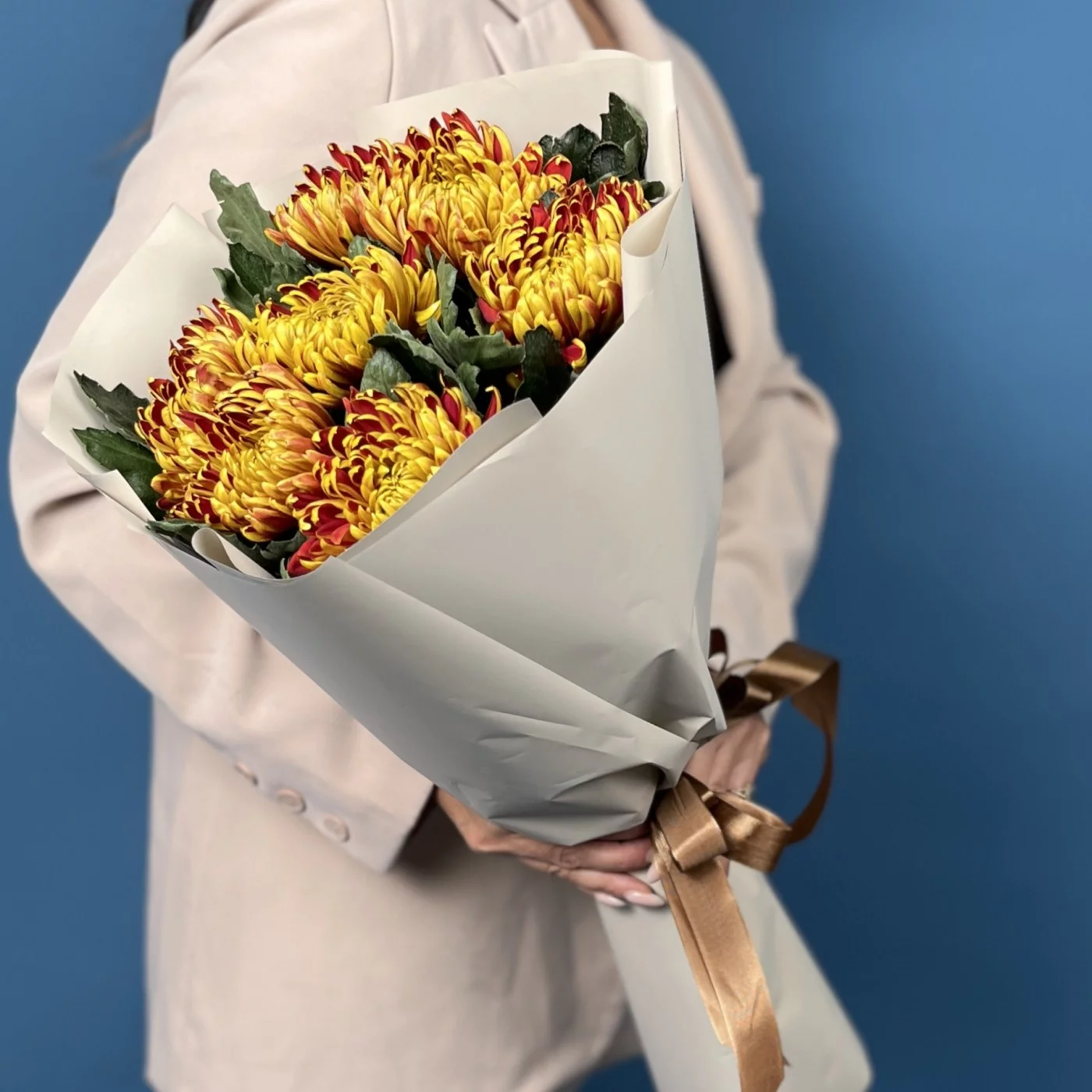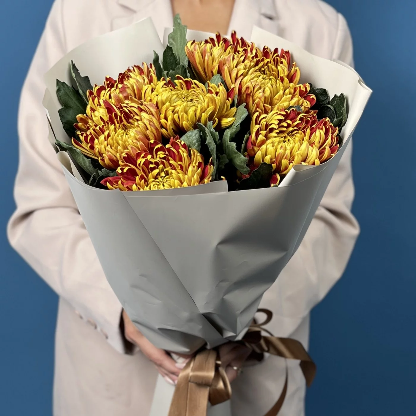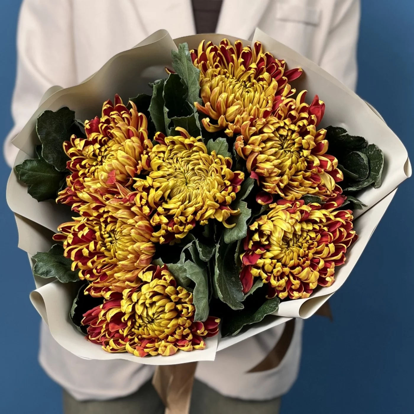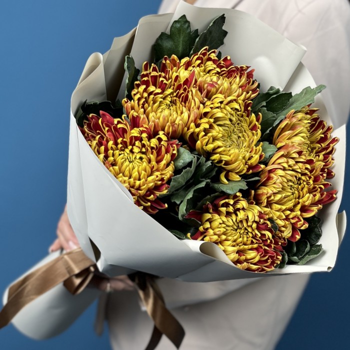Яркая и жизнерадостная композиция из семи хризантем сорта Том Пирс с насыщенными желто-красными оттенками. Этот букет наполнит пространство теплом и праздничным настроением, прекрасно подойдет для подарка и создания уютной атмосферы.