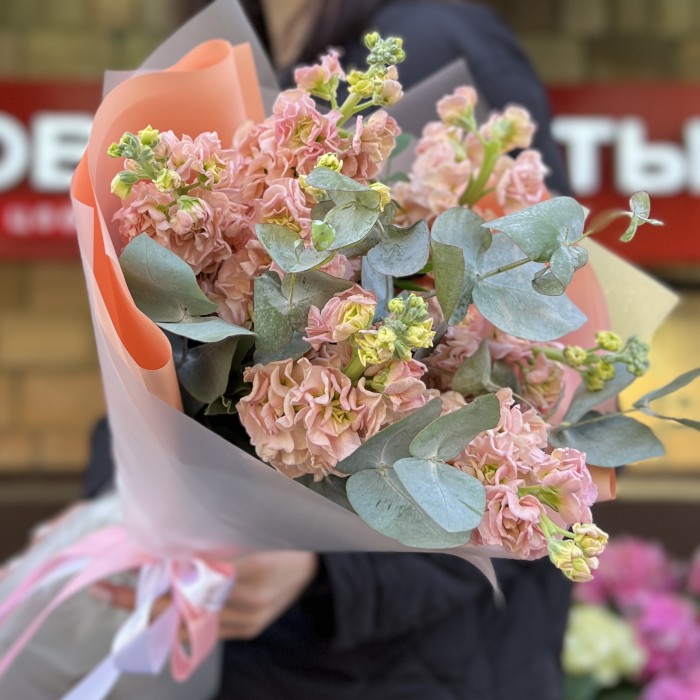 Этот изысканный букет состоит из 7 ароматных персиковых маттиол, дополненных нежными веточками эвкалипта. Теплый персиковый оттенок создает атмосферу уюта, романтики и гармонии, а насыщенный аромат маттиол наполняет пространство свежестью и легкостью. Веточки эвкалипта придают композиции природную элегантность, освежающий аромат.